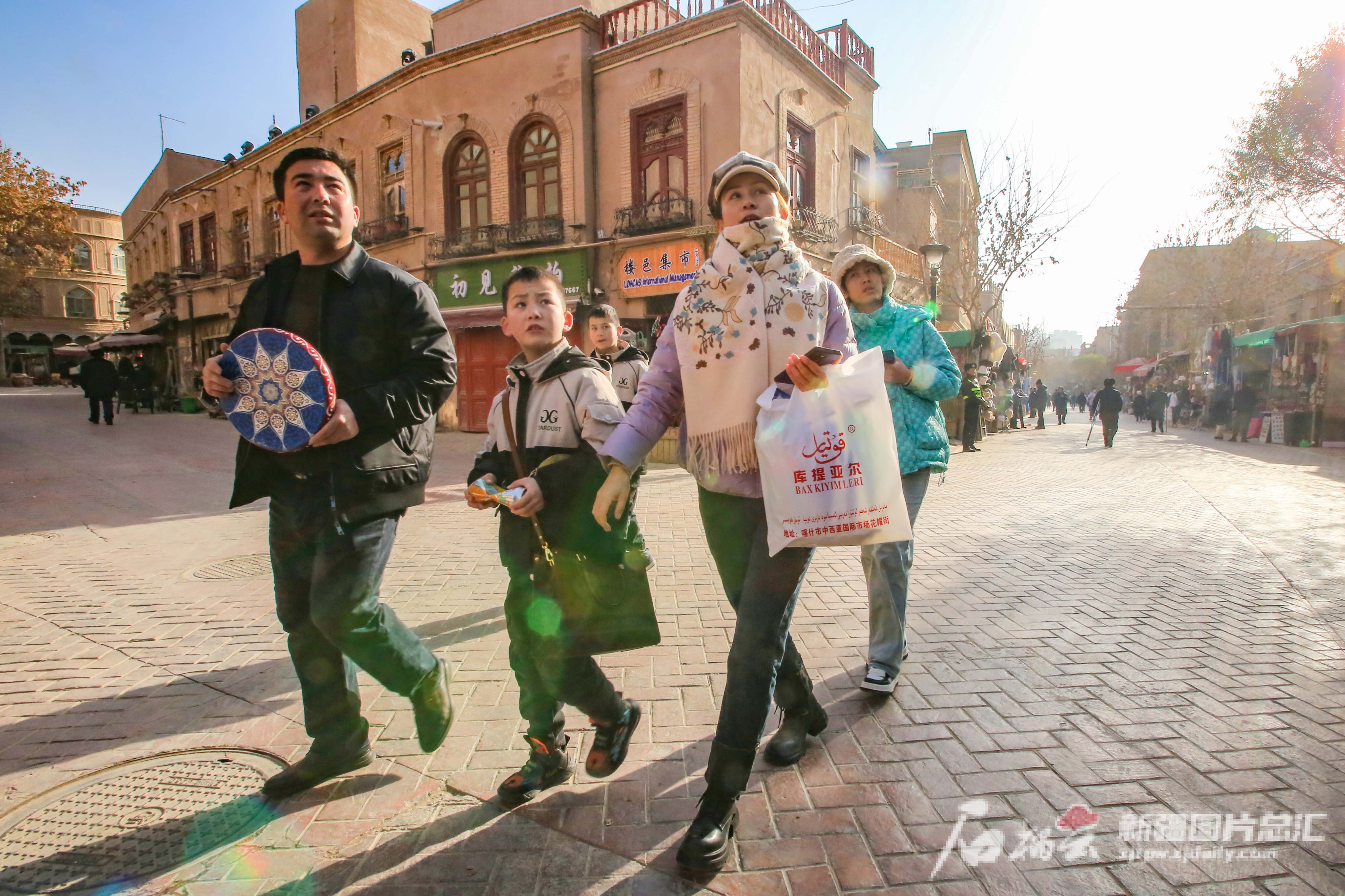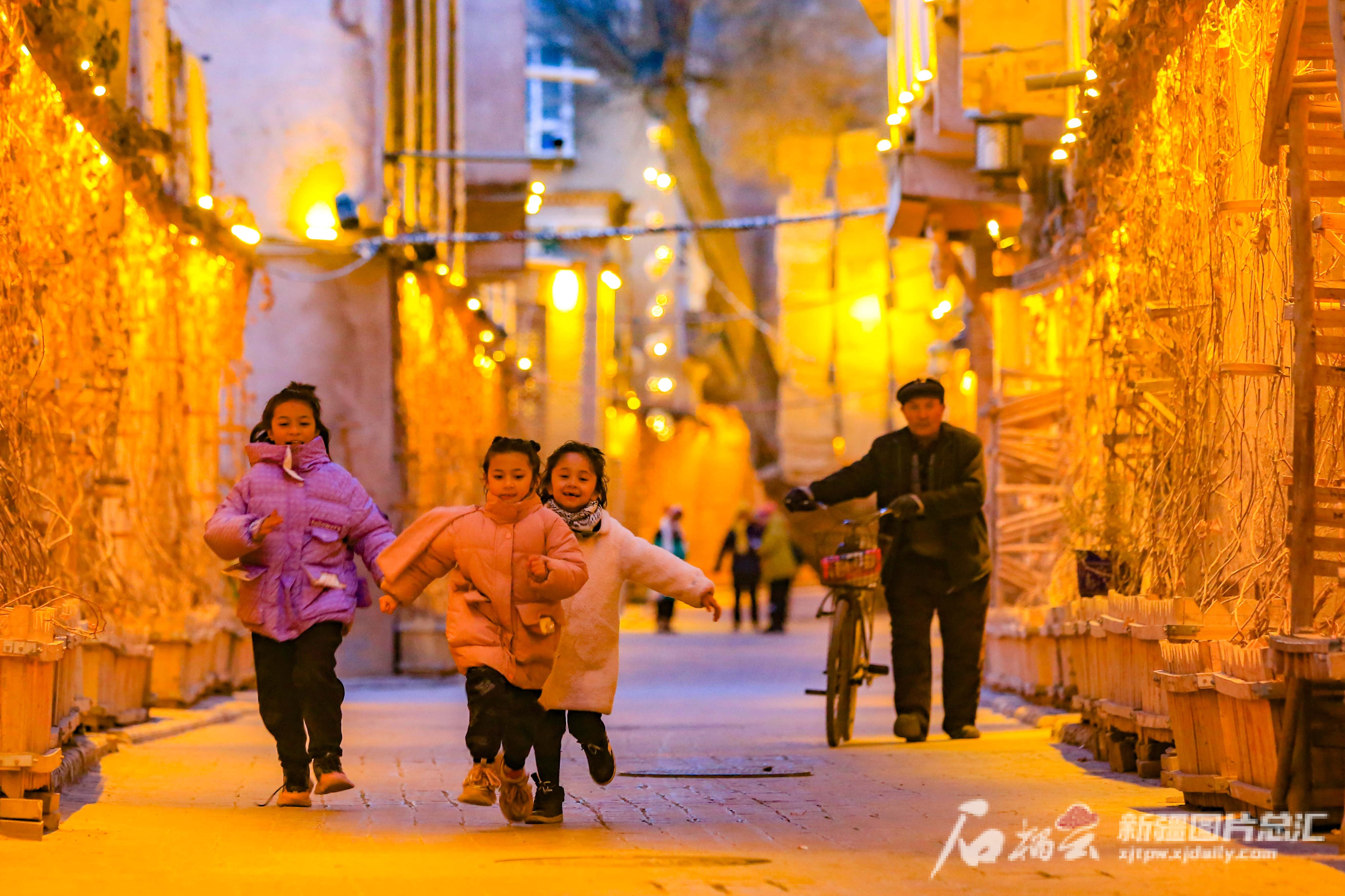 2023年12月31日,小朋友在喀什古城景区追逐玩耍。