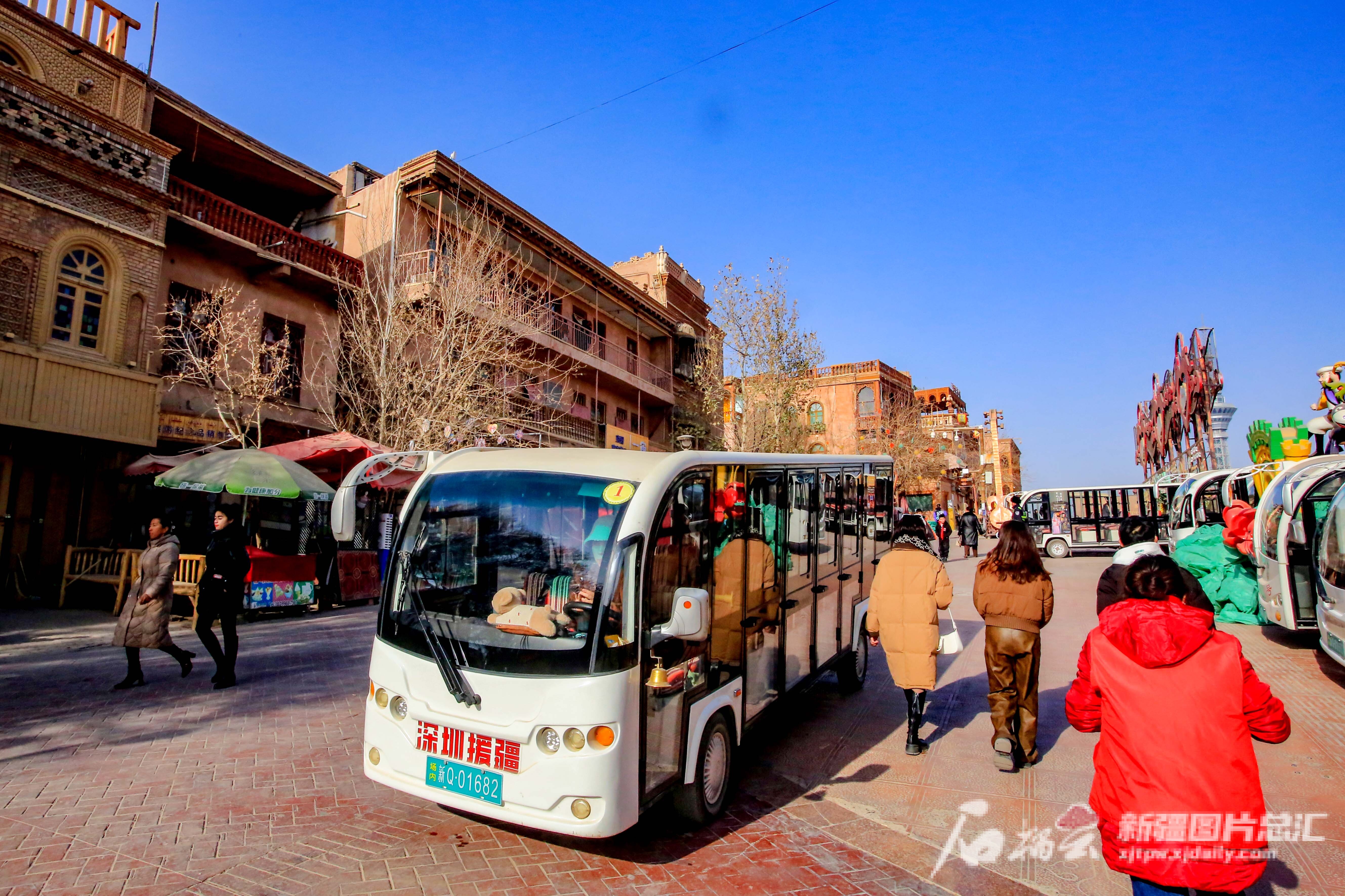 2023年12月31日,游客乘坐观光车在喀什古城景区游览。
