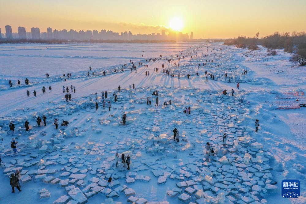 1月7日,在封冻的松花江哈尔滨段,游客在日落时分的“钻石海”游玩(无人机照片)。