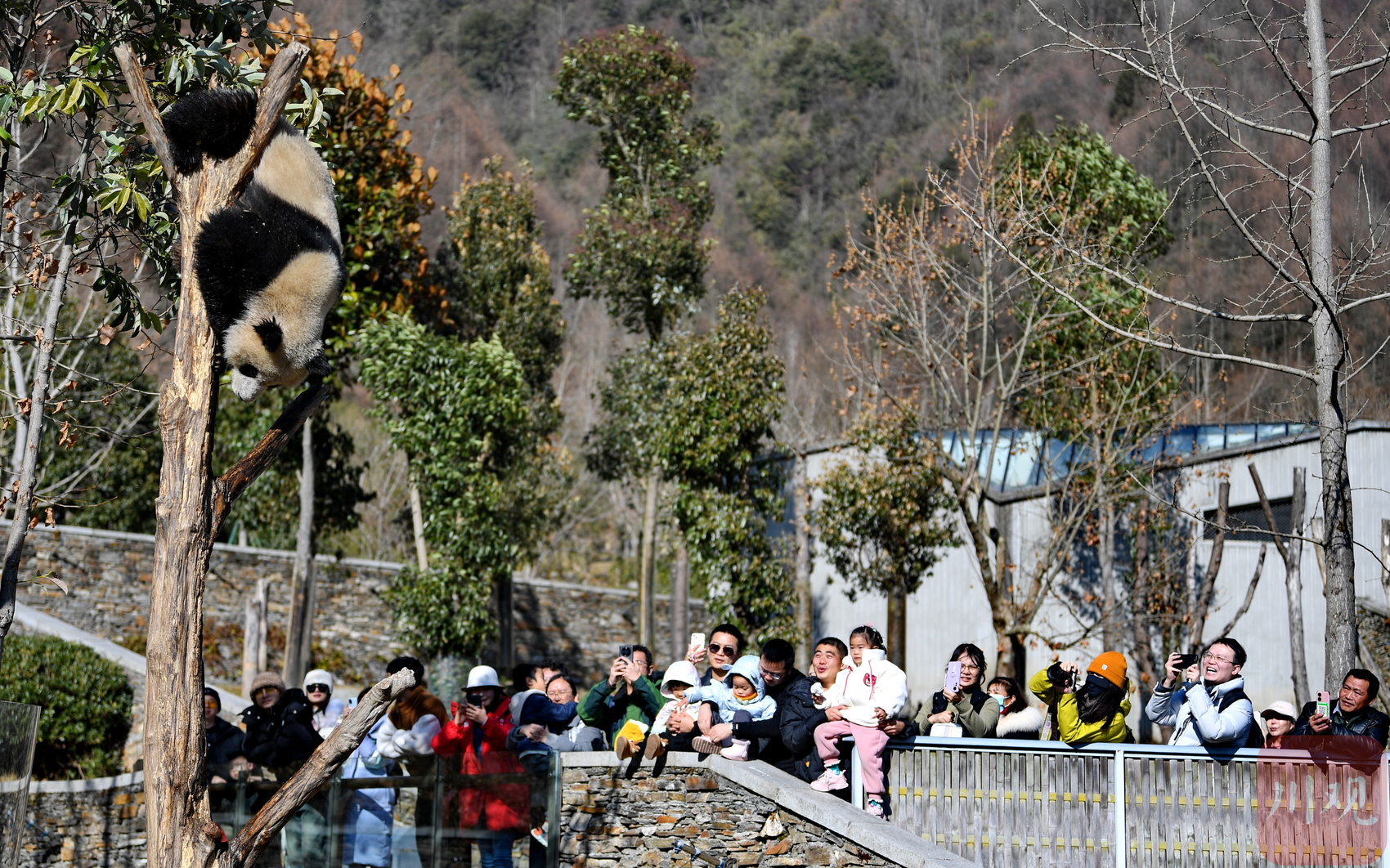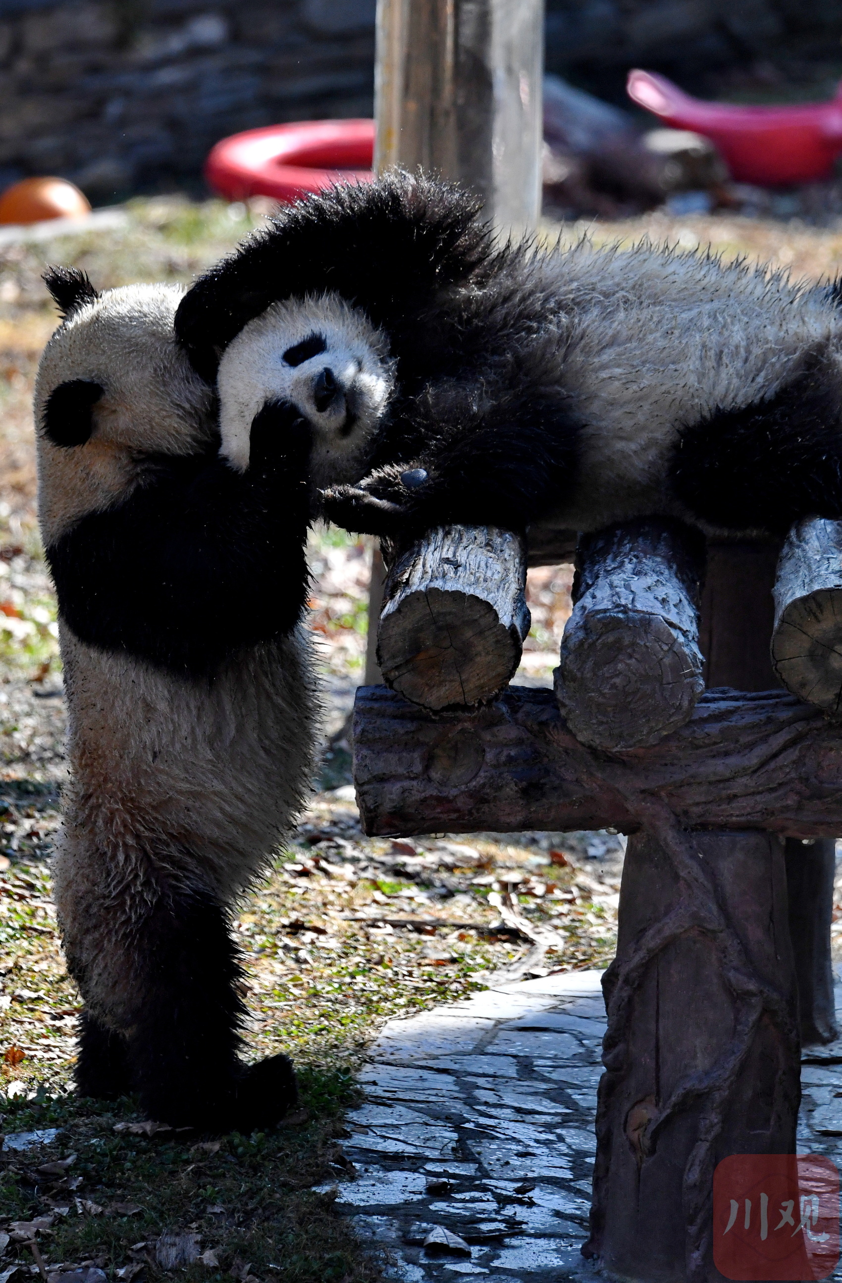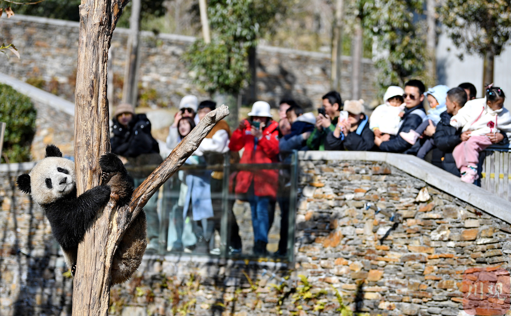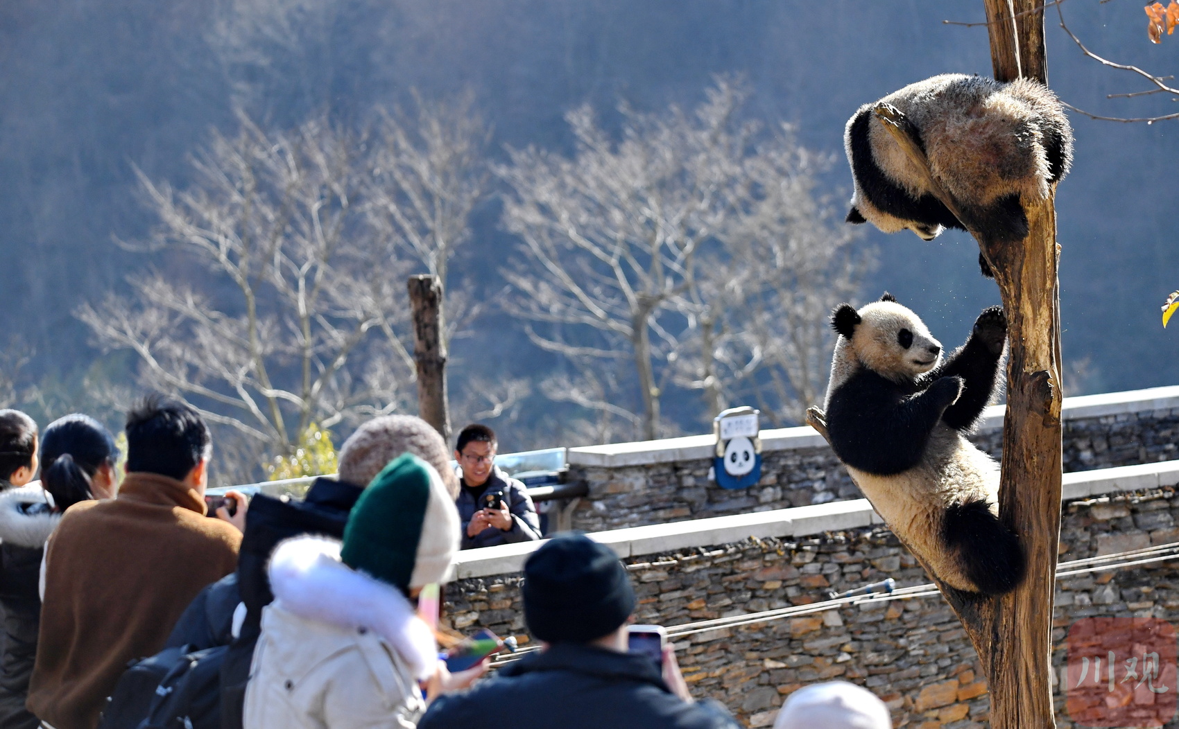 2024年1月6日,位于四川省阿坝州汶川县的卧龙中华大熊猫苑神树坪基地内一片冬日暖阳,大熊猫在享用美食,嬉戏玩耍,萌态十足惹人爱,吸引众多游客驻足围观。