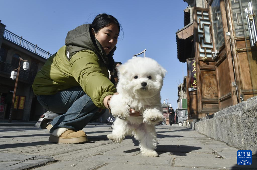 1月6日,游客带宠物在浚县古城游玩。
