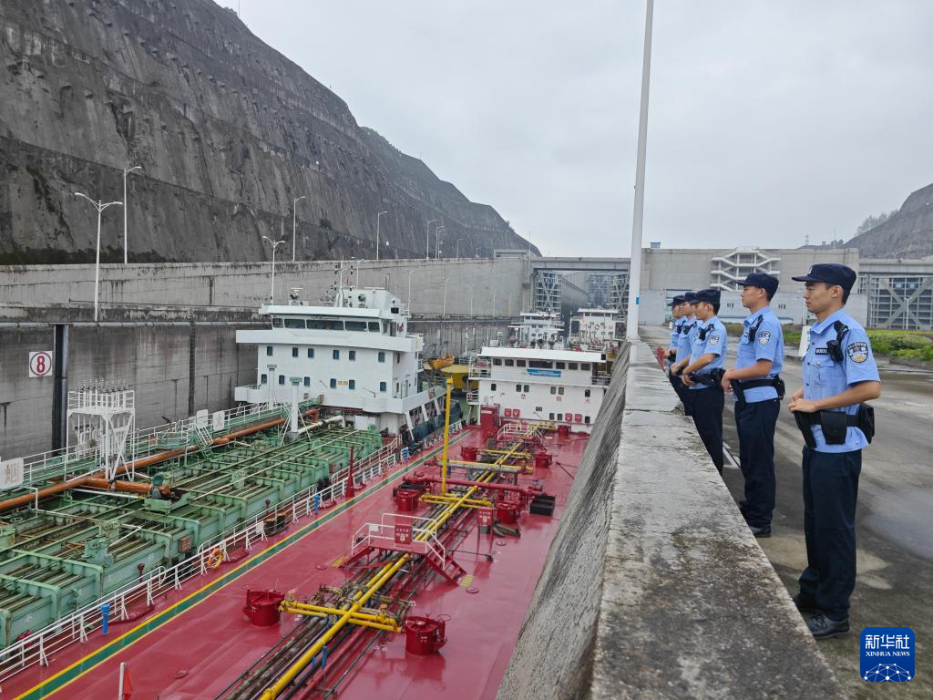 2023年9月29日,长江航运公安局宜昌分局三峡船闸派出所民警在三峡大坝五级船闸执勤。