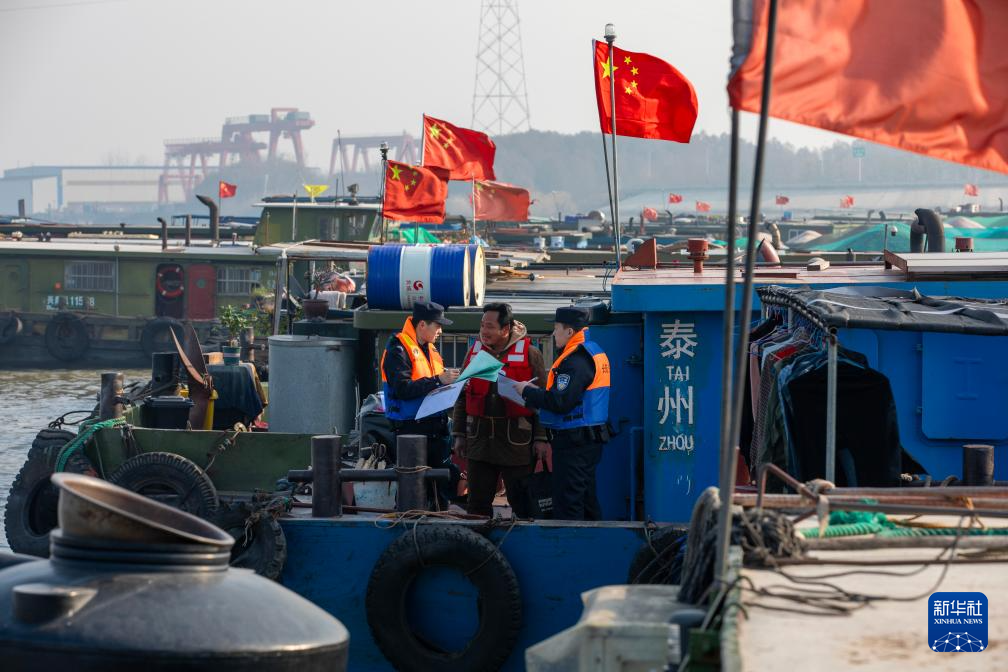 2023年12月28日,长江航运公安局镇江分局民警向辖区停留过元旦的船民普及安全知识,并送上便民服务联系卡。