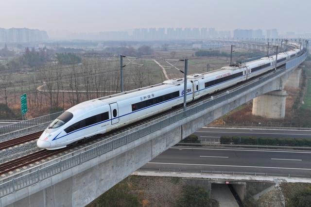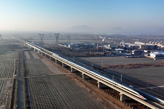 1月10日,一列动车组列车在山东省邹城市大束镇境内行驶(无人机照片)。新华社发(王齐胜摄)