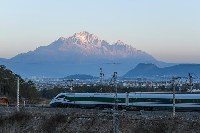 1月10日,在云南丽江玉龙雪山脚下,一列动车组列车在丽香铁路线上行驶。新华社发(赵庆祖摄)