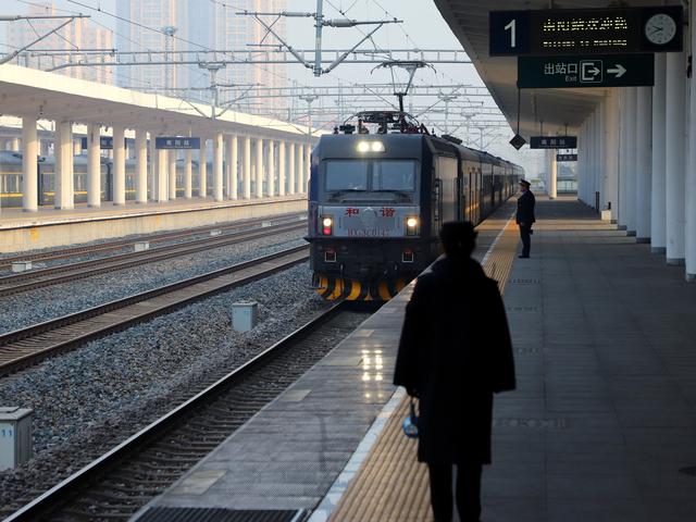 1月10日,在河南省南阳市,一列列车驶入南阳火车站。新华社发(高嵩摄)