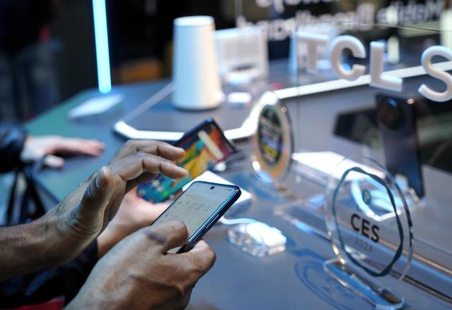 1月11日,参观者在美国拉斯维加斯消费电子展TCL公司展台试用手机。新华社记者 吴晓凌 摄