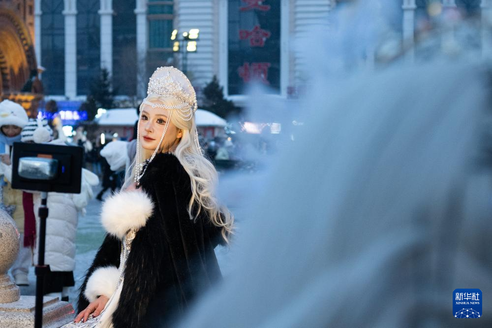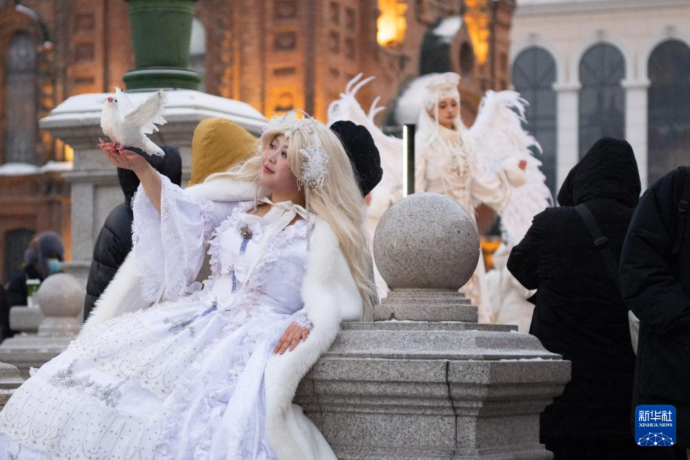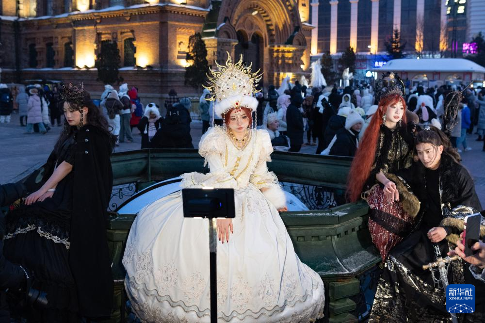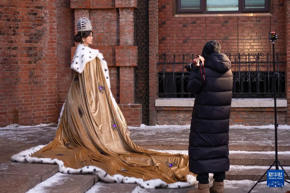 1月11日,游客在哈尔滨建筑艺术广场盛装拍摄写真。