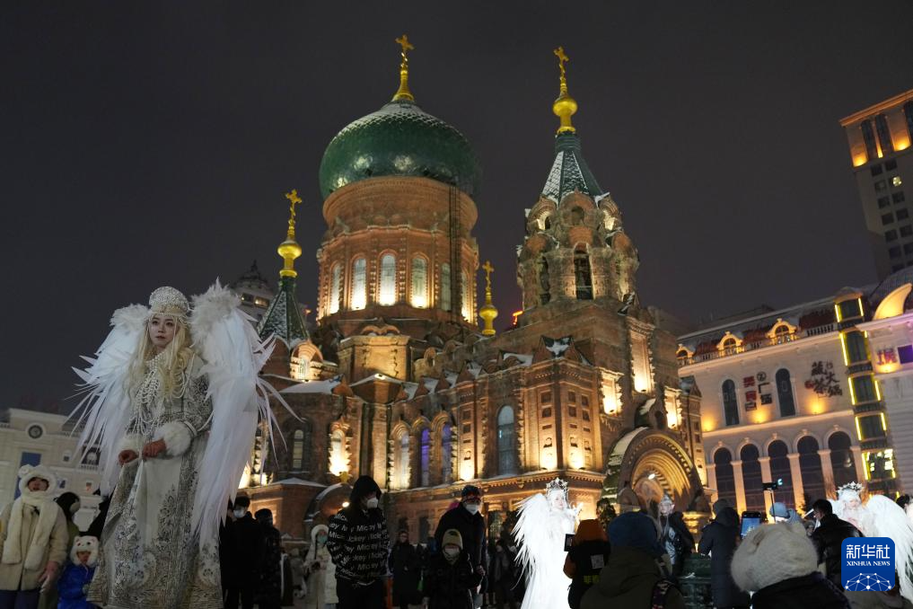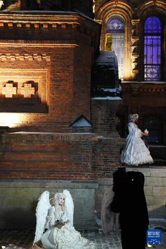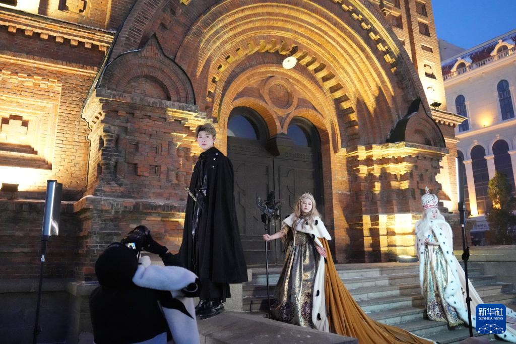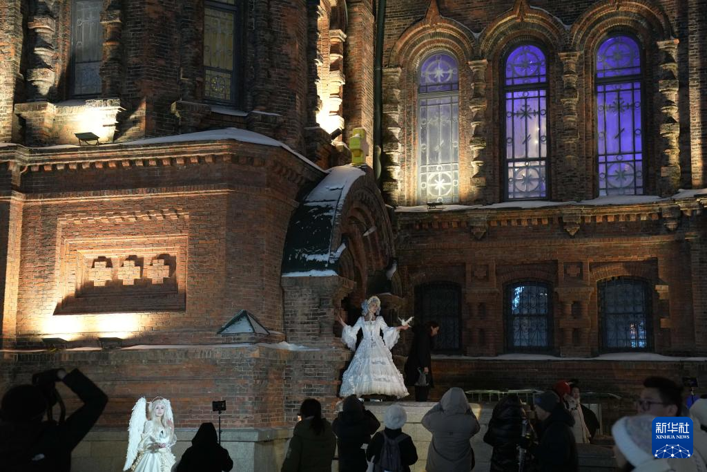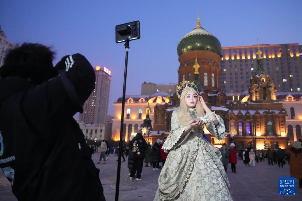 哈尔滨的标志性景点之一索菲亚教堂有着百年历史,目前,它所在的哈尔滨建筑艺术广场每天都有许多游客身着盛装拍摄写真,在“冰城”上演冬季浪漫。