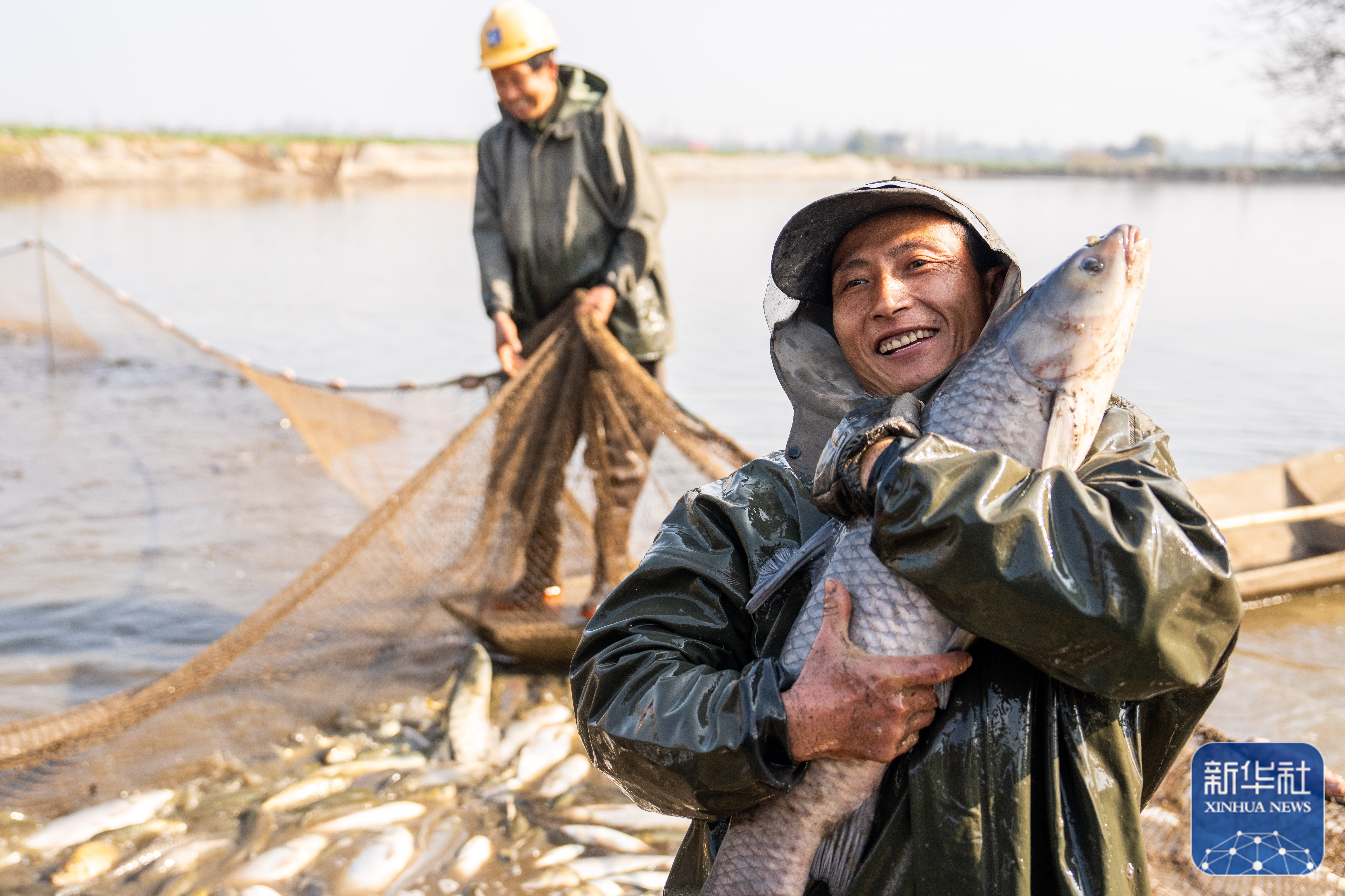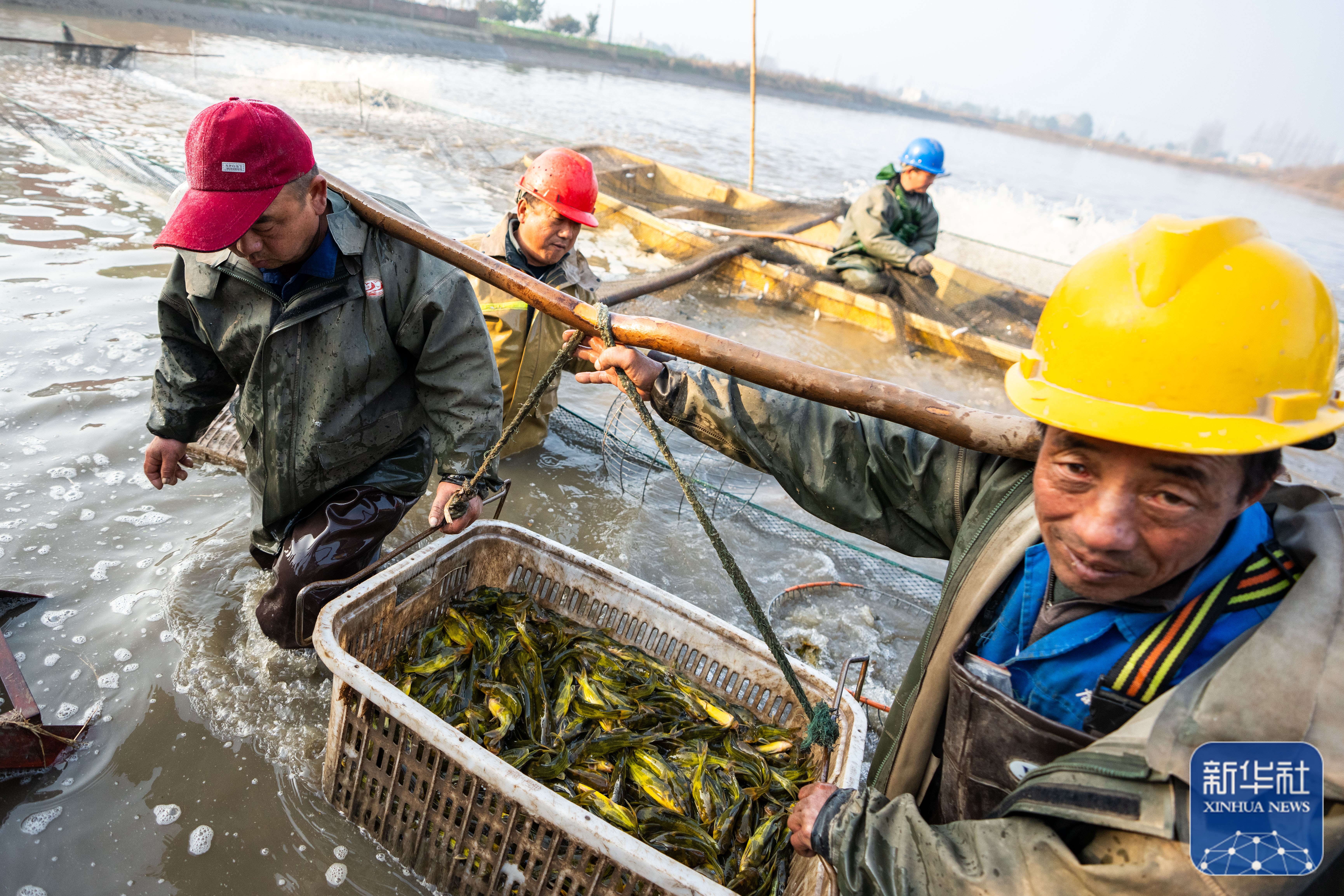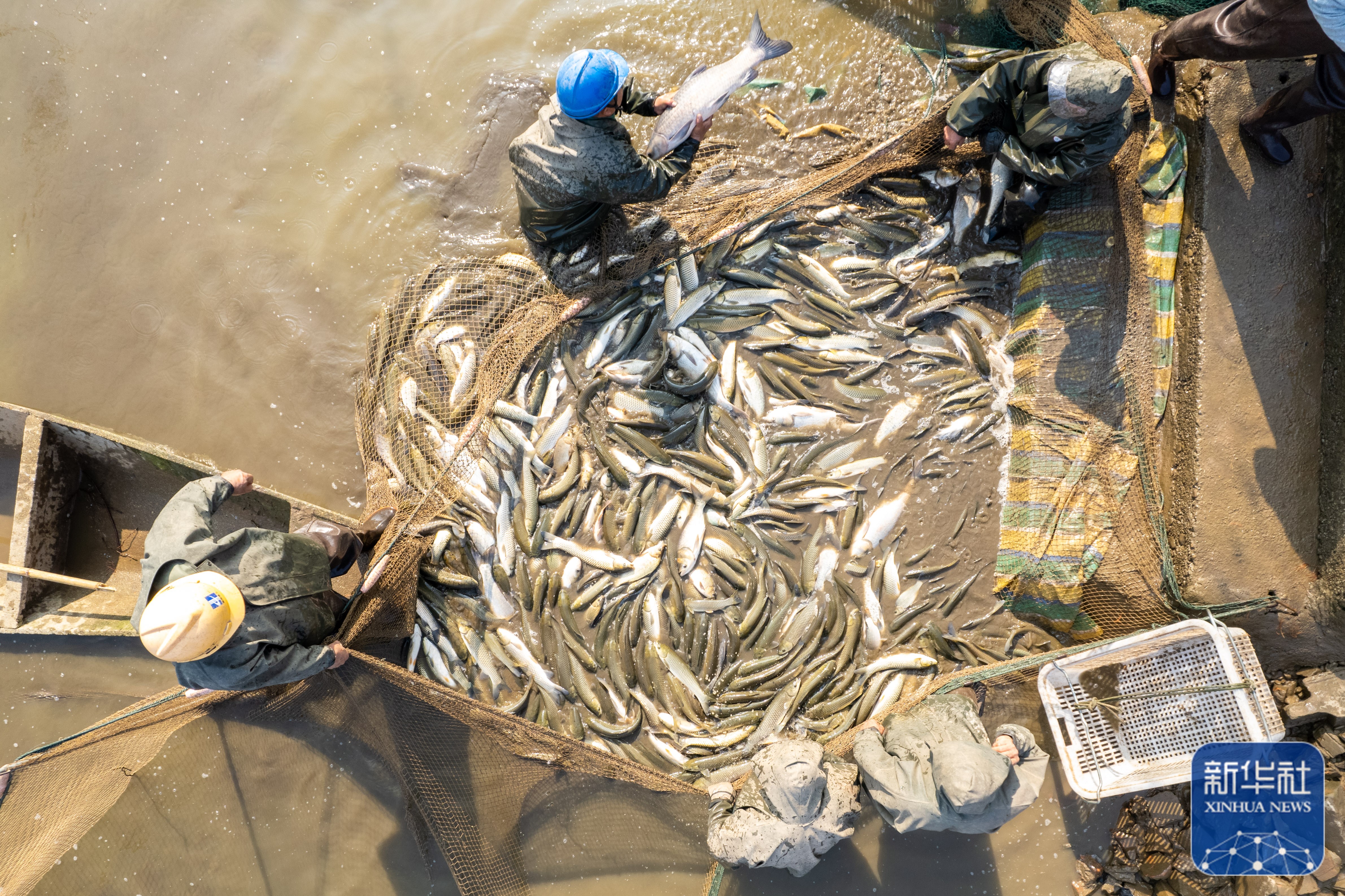 近日,湖南省益阳市武圣宫镇千亩渔场活鱼丰收,渔民加紧展开冬捕,鲜鱼打捞上岸后立即被收购供应市场。据了解,南县共有池塘养殖面积约8.4万亩、稻虾综合种养面积约62万亩,主要养殖小龙虾、四大家鱼、翘嘴、鳜鱼、黄颡鱼、龟、鳖等水产品种,2023年水产品年产量达16.2万吨。