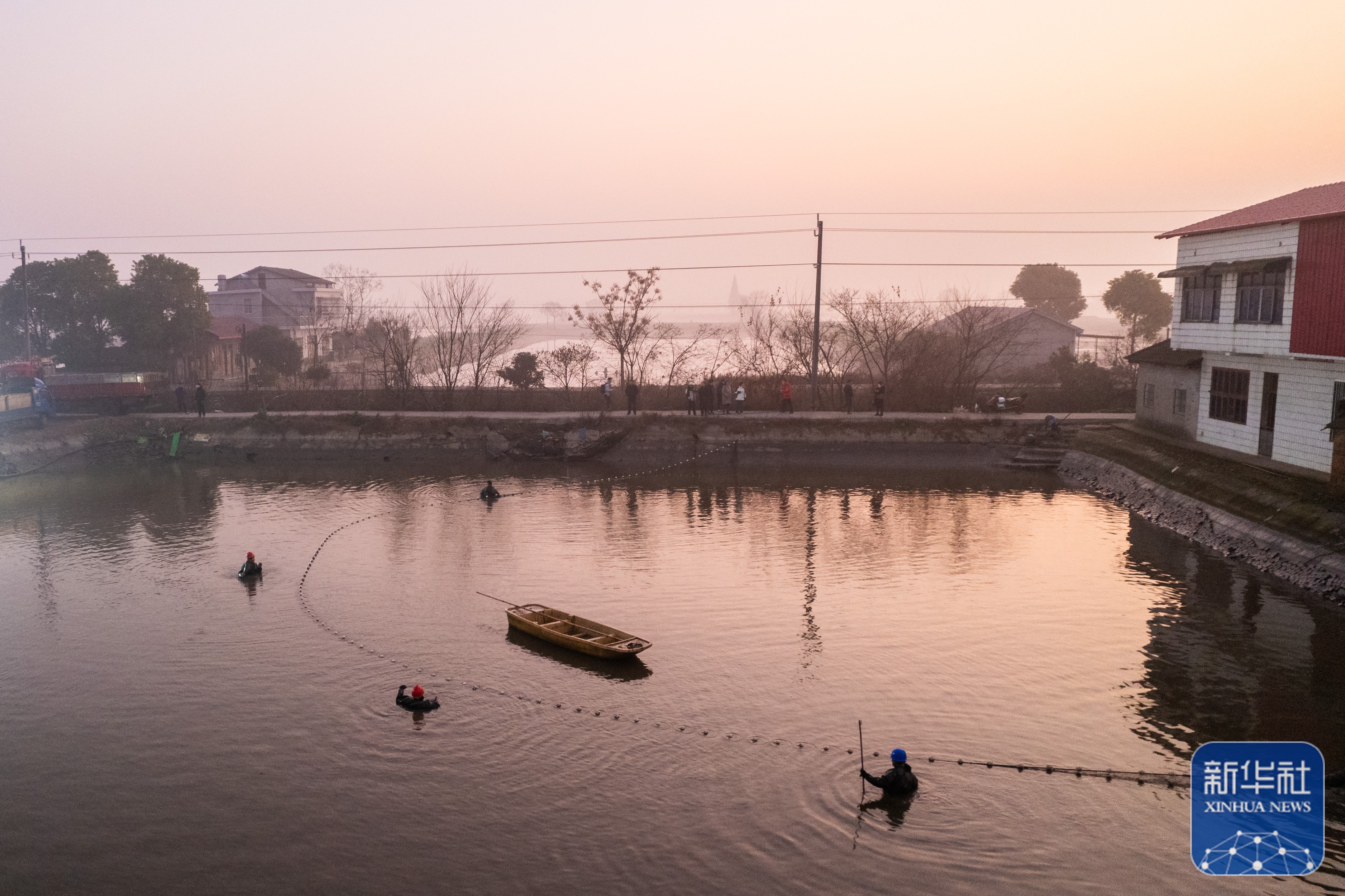 1月13日清晨,渔民在湖南省益阳市武圣宫镇沿河堤村拉网捕鱼(无人机照片)。
