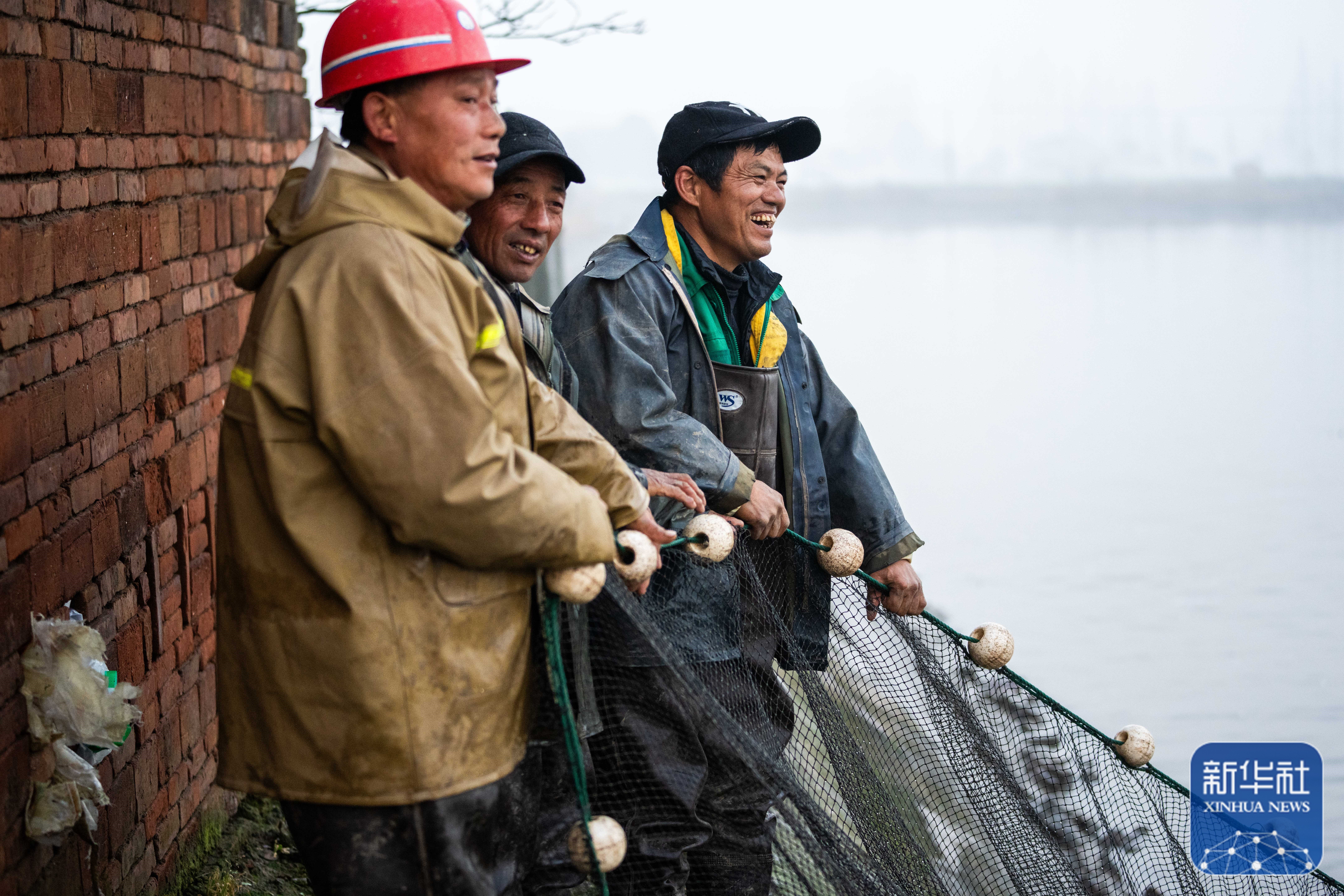 1月13日清晨,渔民在湖南省益阳市武圣宫镇沿河堤村拉网捕鱼。