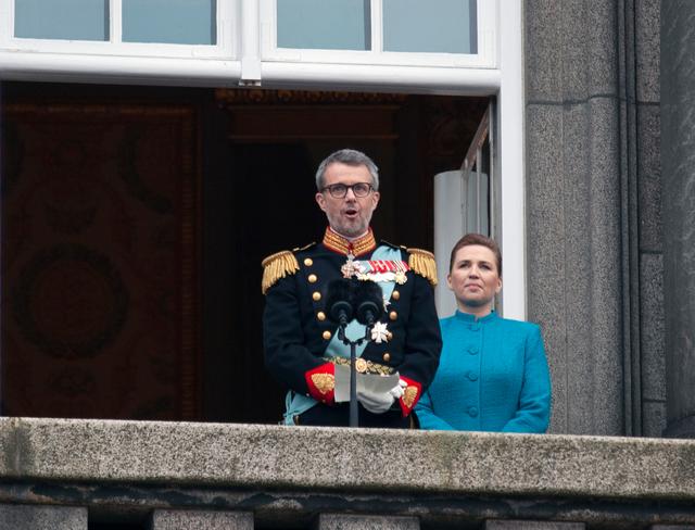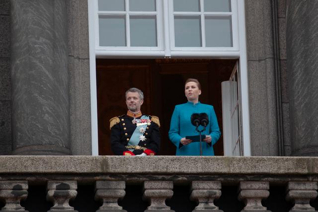 1月14日,丹麦首相弗雷泽里克森(右)在首都哥本哈根克里斯蒂安堡宫的阳台上宣布,腓特烈正式继位成为国王腓特烈十世。新华社记者 林晶 摄