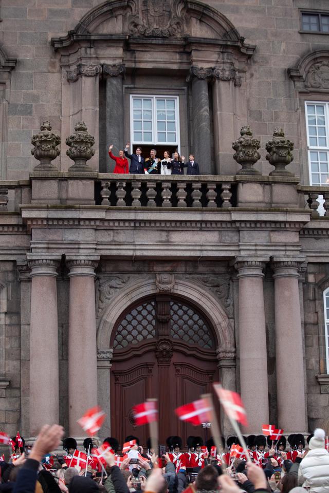 1月14日,丹麦国王腓特烈十世一家在首都哥本哈根克里斯蒂安堡宫的阳台上接受民众祝贺。新华社记者 林晶 摄