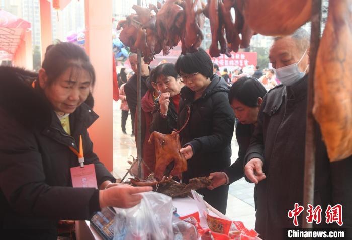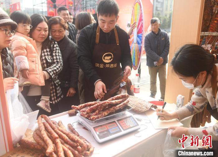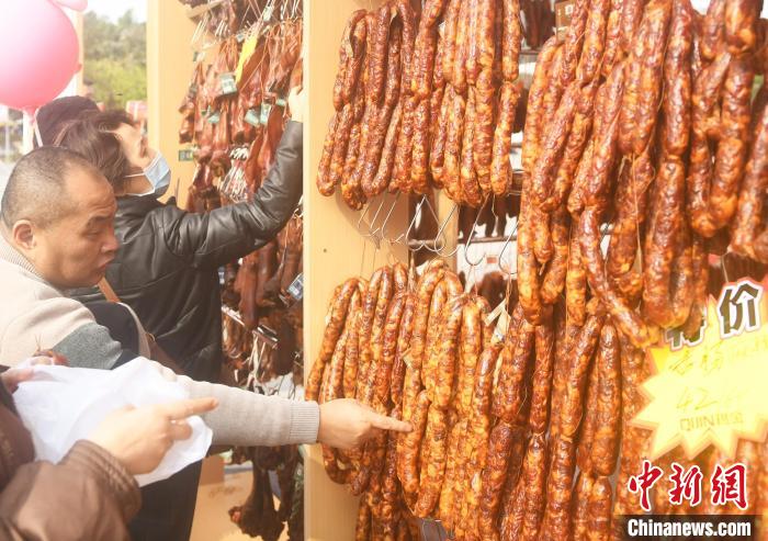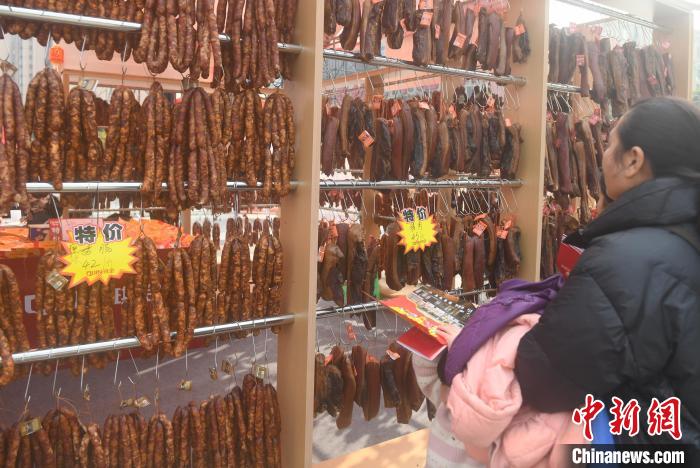 图为市民选购腊肉、香肠。 中新网 记者 周毅 摄