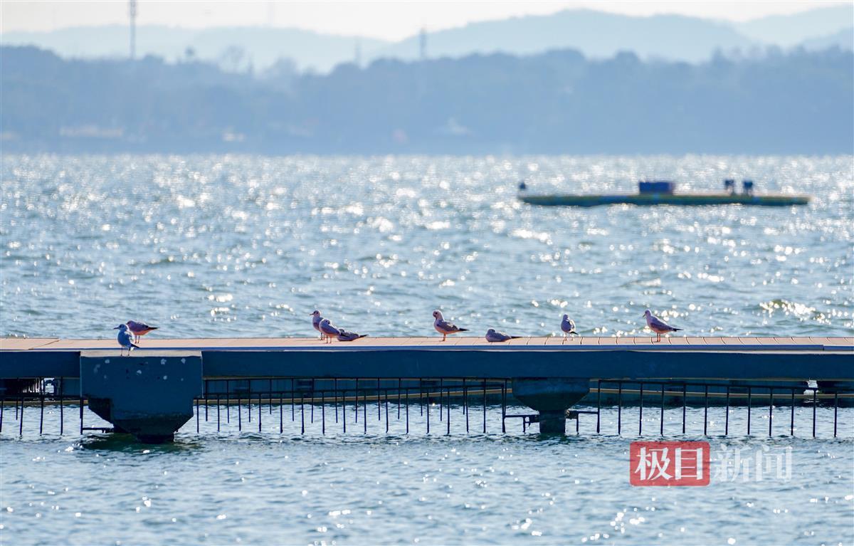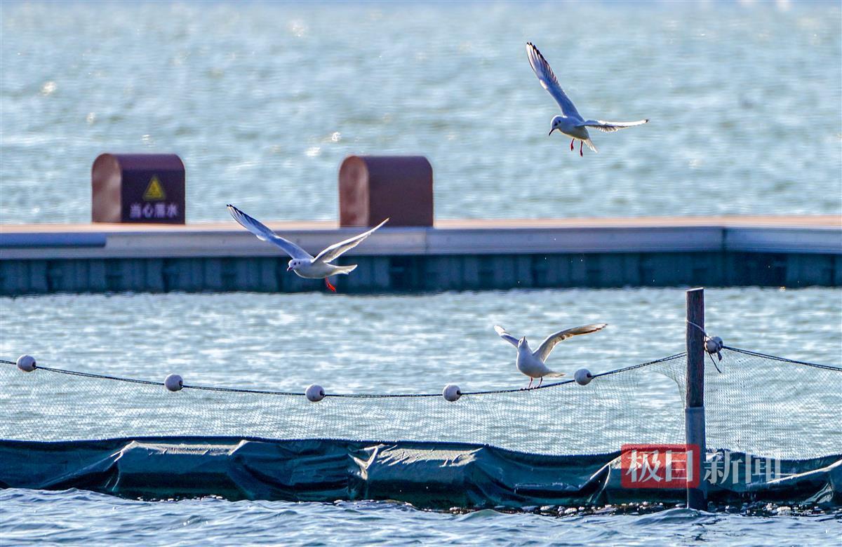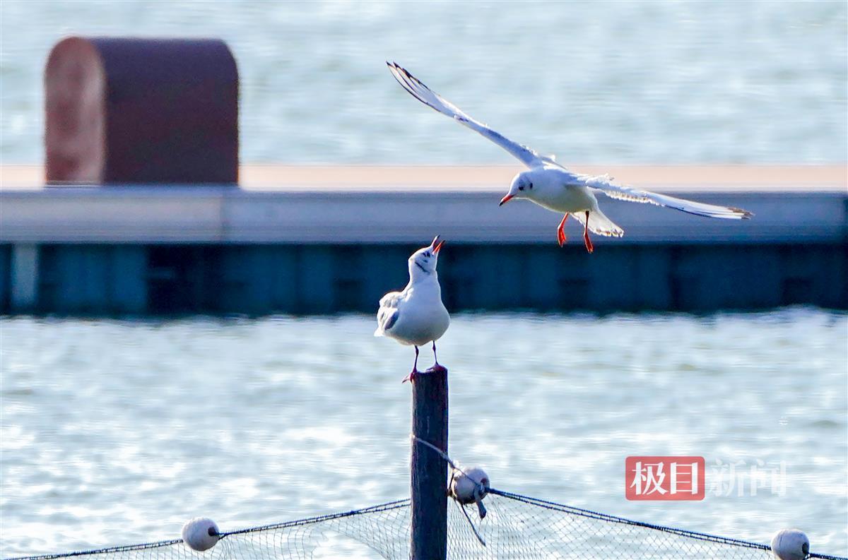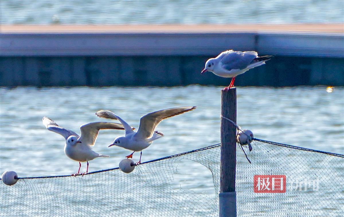 极目新闻记者现场看到,除了红嘴鸥这些“白色精灵”,泳场附近水域还有不少的绿头鸭、小䴙䴘及西伯利亚银鸥等水鸟,它们或在湖中觅食,或在栈道上晒太阳,或腾空相互追逐嬉戏。
