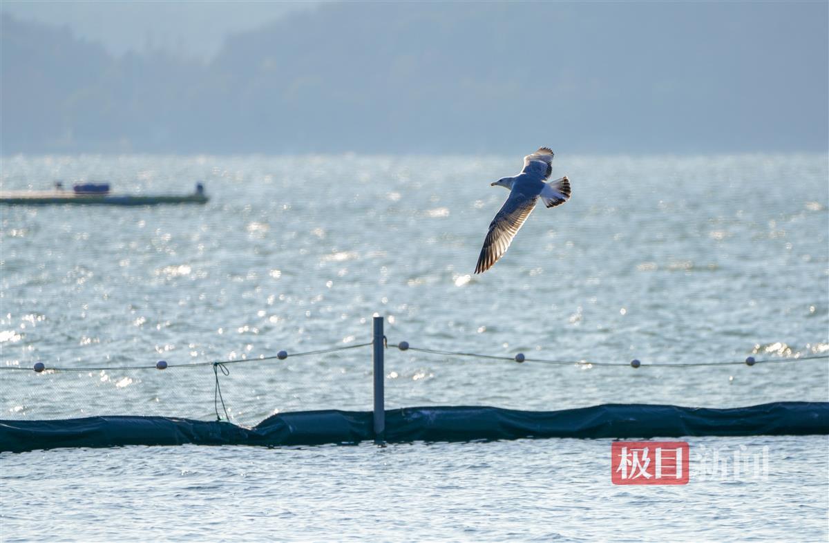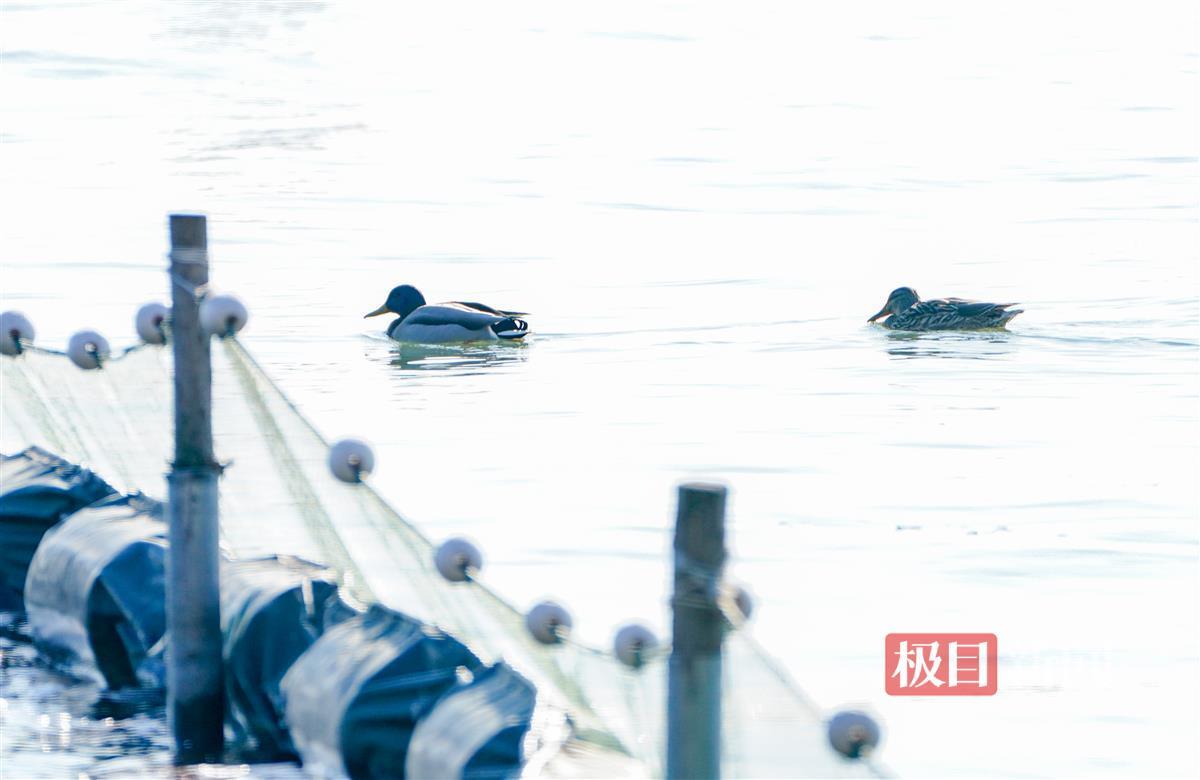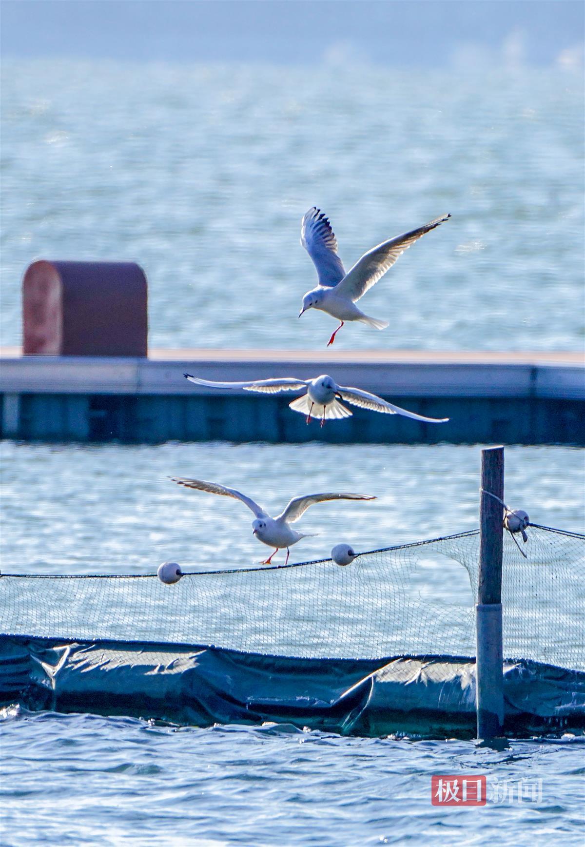 极目新闻记者现场看到,除了红嘴鸥这些“白色精灵”,泳场附近水域还有不少的绿头鸭、小䴙䴘及西伯利亚银鸥等水鸟,它们或在湖中觅食,或在栈道上晒太阳,或腾空相互追逐嬉戏。