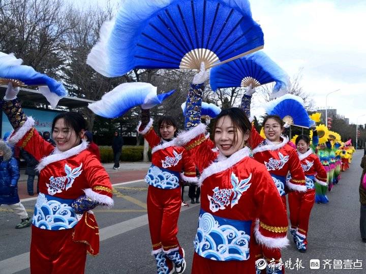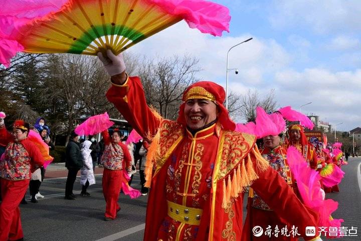 2月1日,威海市环翠区张村镇,村民在表演独具特色的胶东民俗大秧歌。