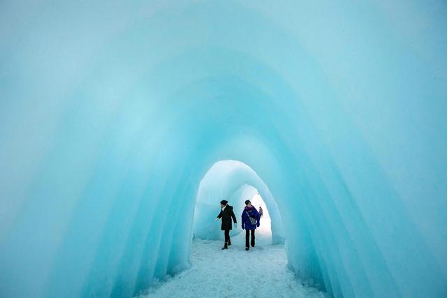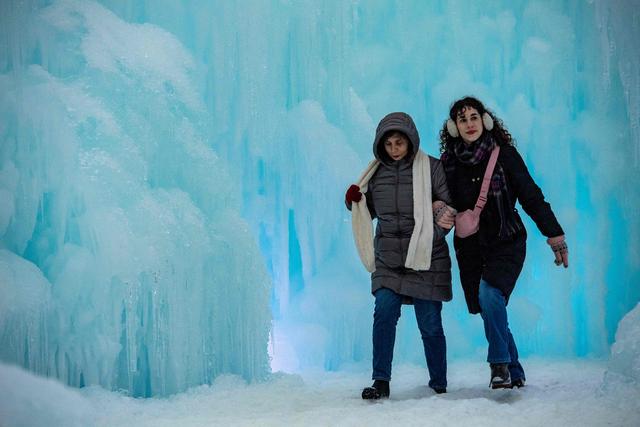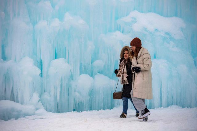 2月1日,在美国新罕布什尔州北伍德斯托克,人们游览冰雪城堡。新华社/法新