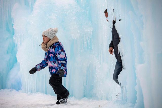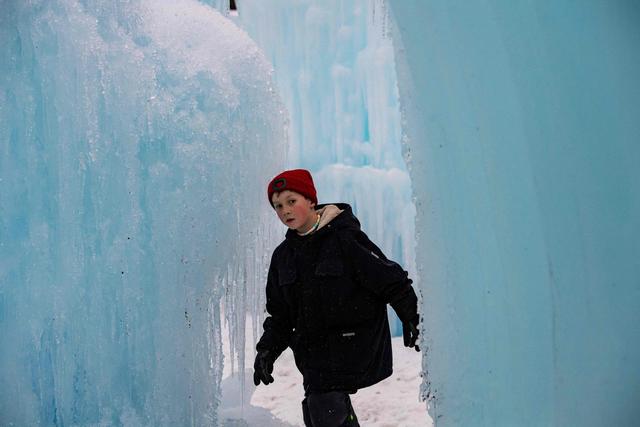 2月1日,在美国新罕布什尔州北伍德斯托克,一名儿童游览冰雪城堡。新华社/法新