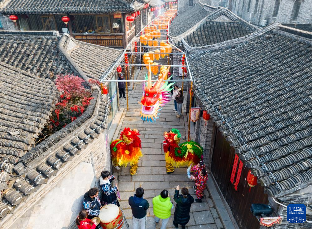 2月8日,在江苏省兴化市昭阳街道八字桥文旅休闲街区,市民在观看舞狮表演(无人机照片)。
