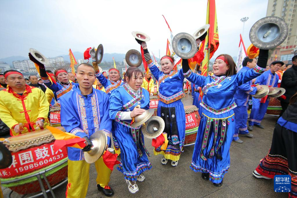 2月7日,在贵州省铜仁市玉屏侗族自治县舞阳广场,民间艺人在敲击“闹年锣”。