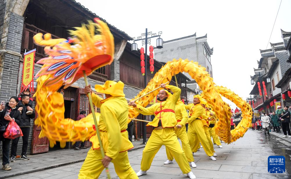 2月7日,参演人员在江西省樟树市临江镇进行舞龙等民俗文化巡演活动。