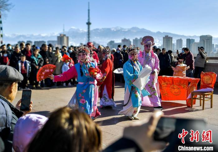 红山公园山顶平台,市民观看传统曲子戏演出。 中新网记者刘新摄