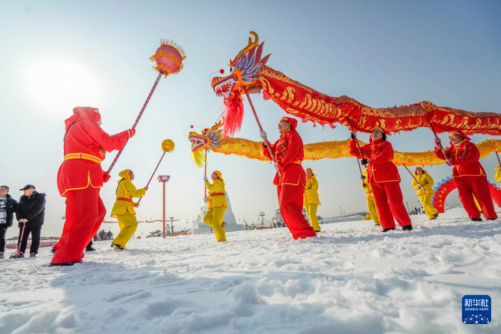 2月12日,民间艺人在河北省遵化市团瓢庄镇山里各庄雪乡景区表演舞龙。新华社发(刘满仓摄)
