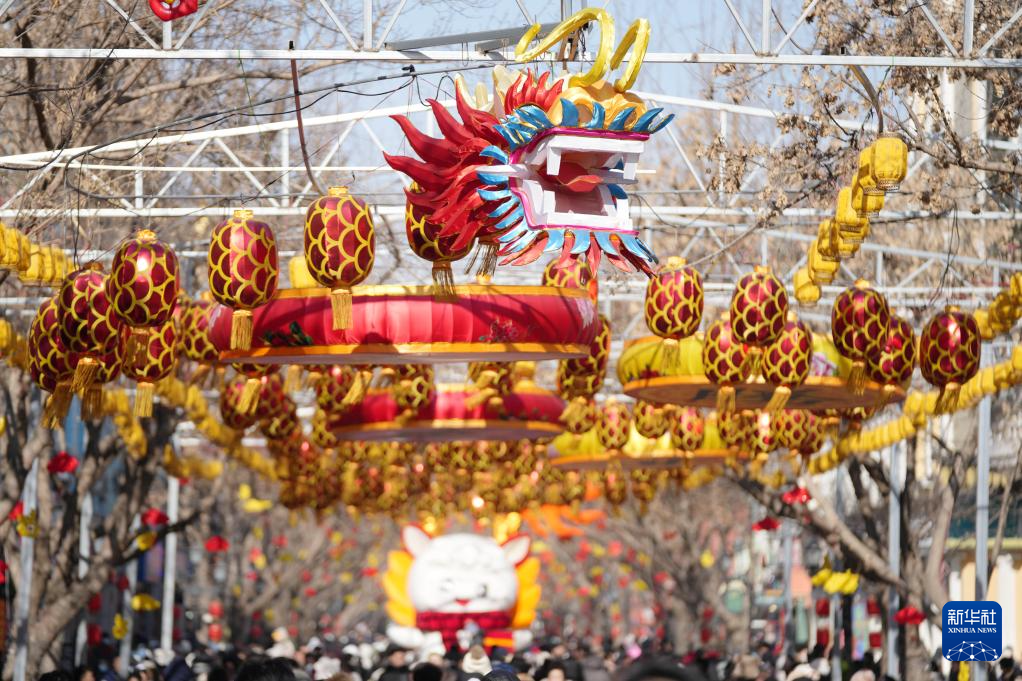2月12日,在石家庄市土门关驿道小镇,孩子们戴上龙头帽,感受新春年味儿。新华社发(张晓峰摄)
