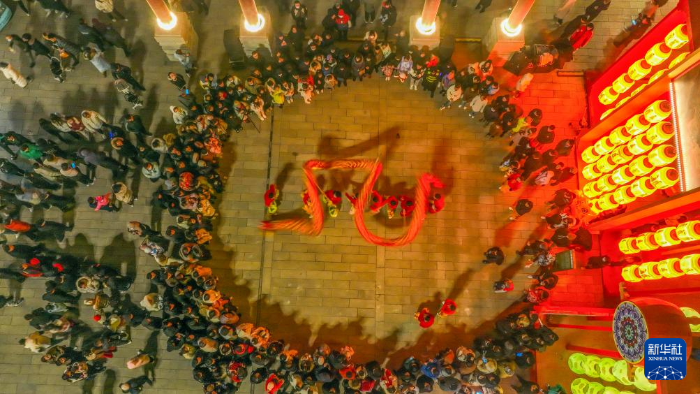 2月11日晚,游客在河北省唐山市丰南区河头老街观看舞龙表演(无人机照片)。新华社发(李磊摄)