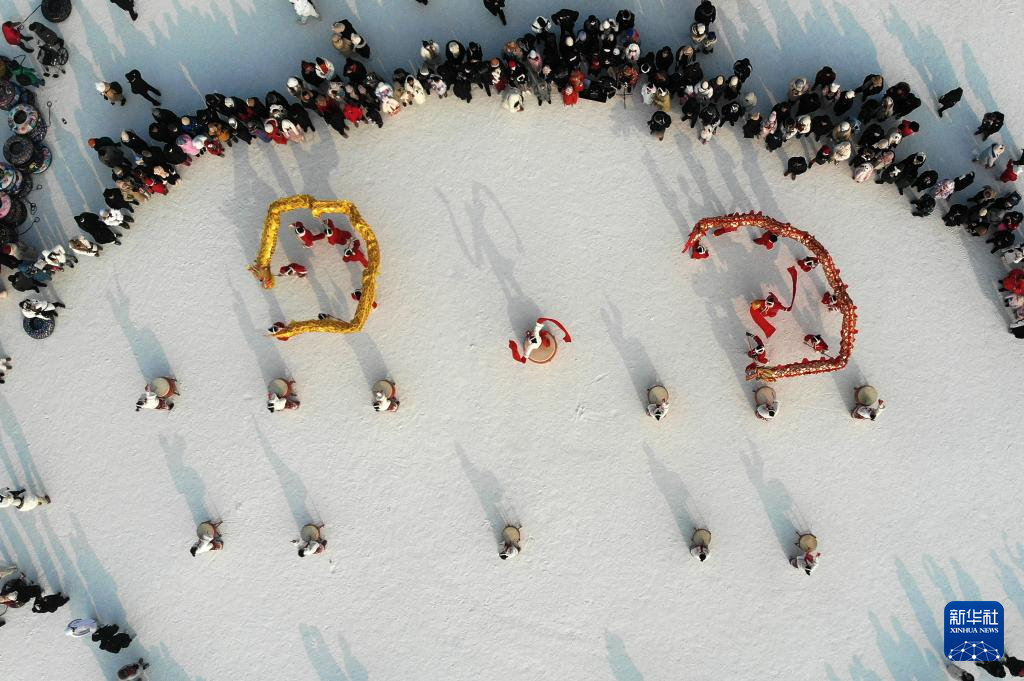 2月10日,在哈尔滨冰雪大世界园区内,游客观看舞龙表演(无人机照片)。新华社记者王建威摄