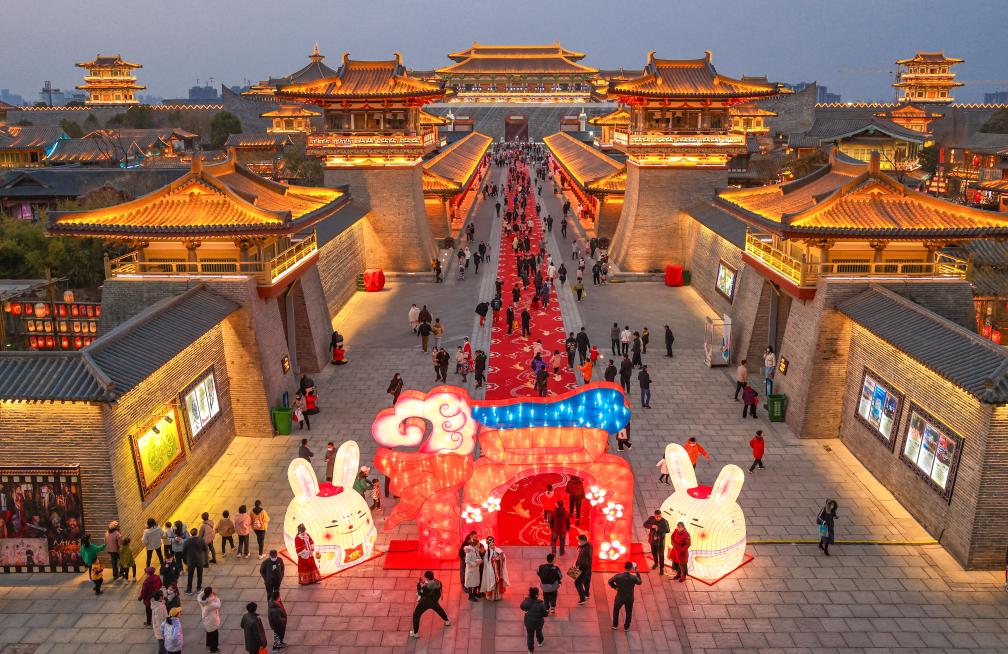 2018年2月16日,游人在江苏省淮安市清江浦庙会上参观游览。 2023年1月18日,游客在湖北省襄阳市唐城春节庙会赏灯、游览。