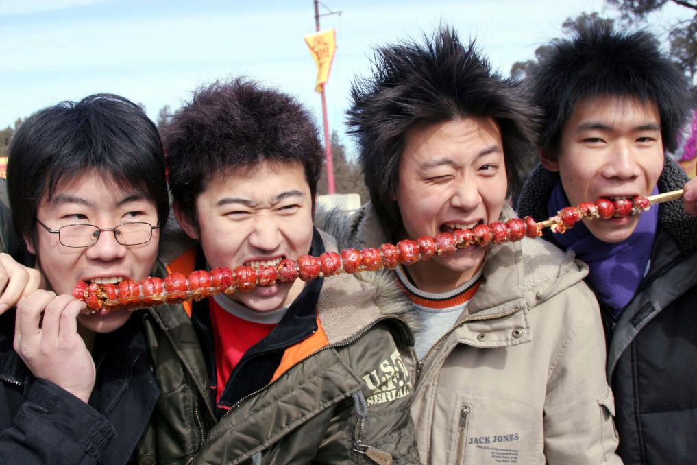 2005年2月10日,4名游客在北京地坛庙会上品尝一串1米多长的冰糖葫芦。