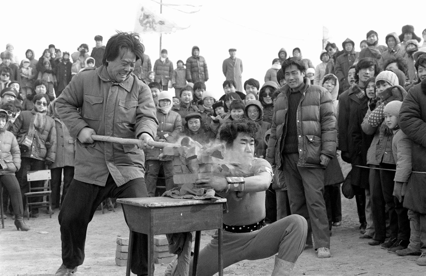 在1988年北京龙潭公园春节庙会上,民间艺人表演硬气功。