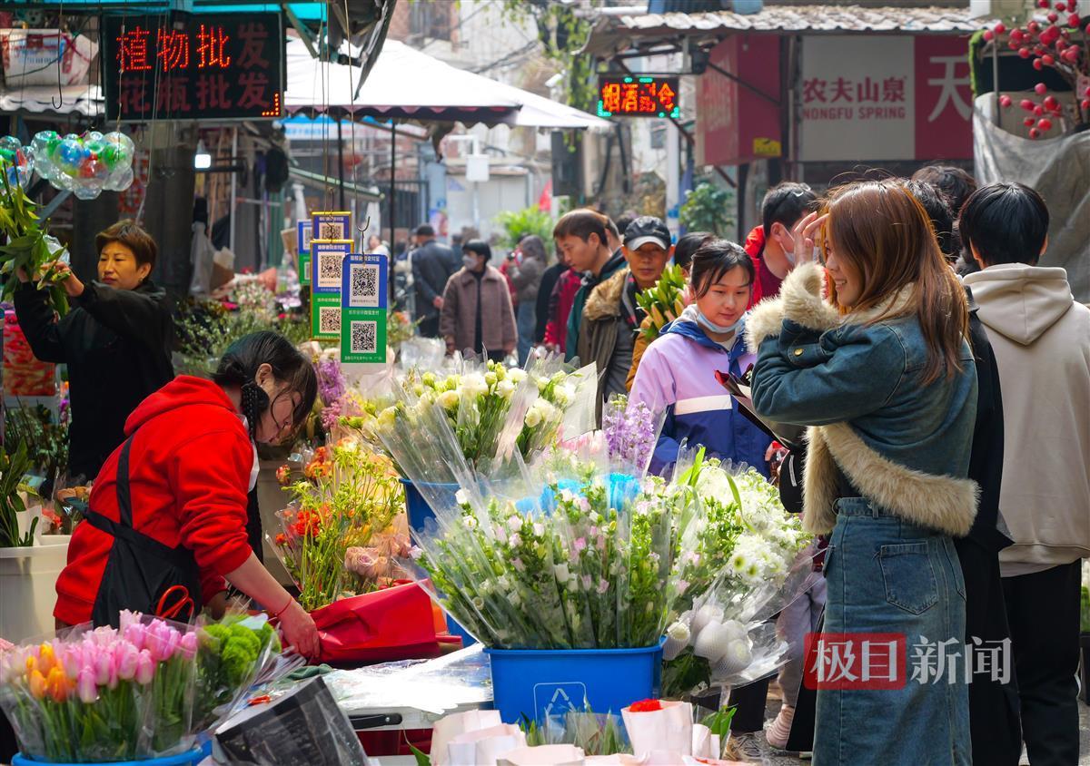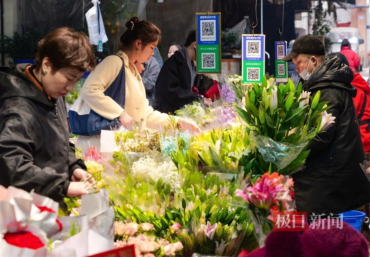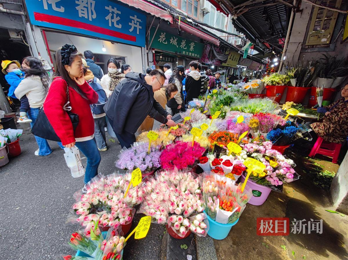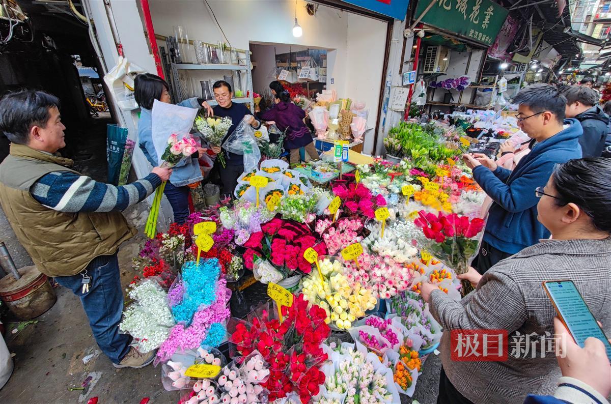 2月14日,农历大年初五,是传统“迎财神”的日子,今年又“巧遇”情人节,喜上加喜。当日,汉口循礼门花卉市场繁花似海,一派热闹景象。