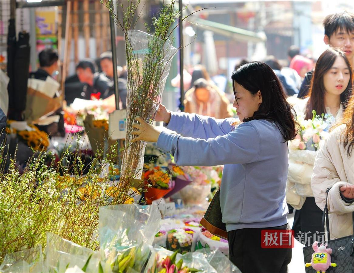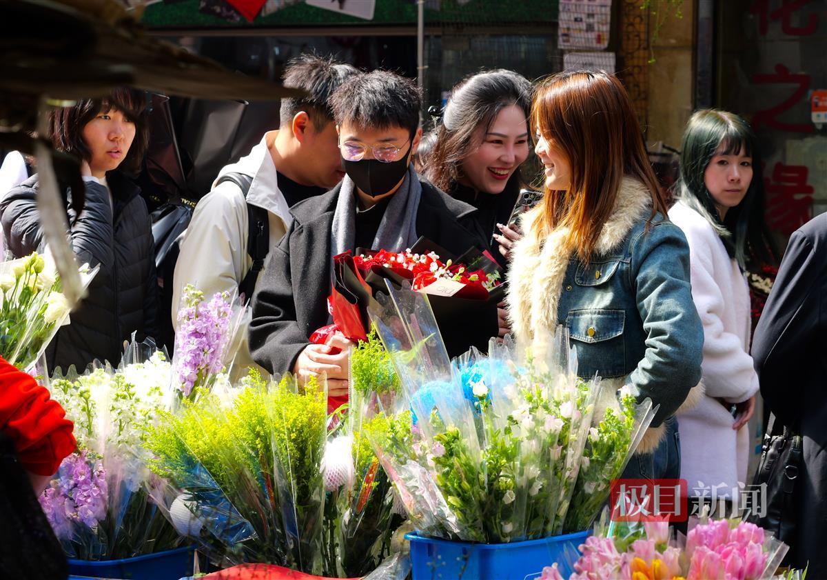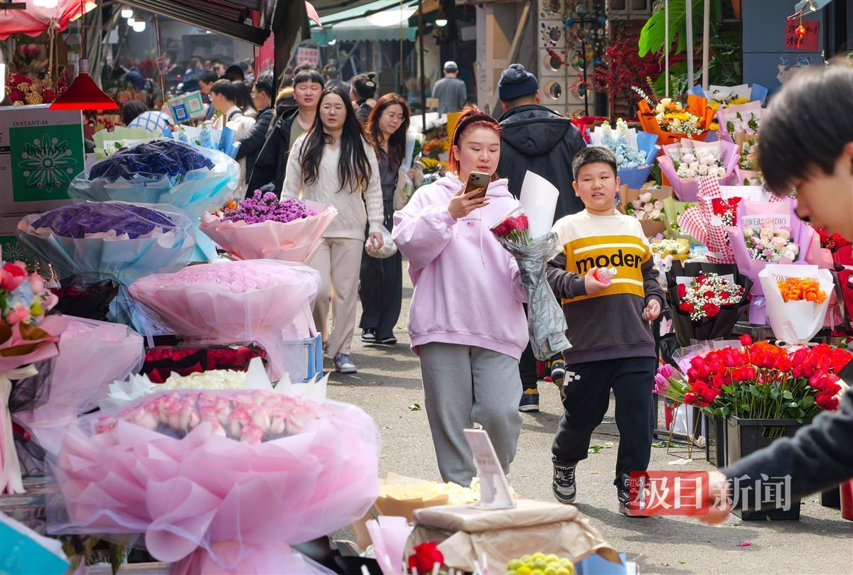 除了传统年宵花外,情人节专属的各色玫瑰也销售火爆,不少年轻情侣来此选购鲜花。“3块一枝的红玫瑰和4块一枝的荔枝玫瑰卖得特别好,和节前一个价。” 花店经营者陶女士告诉记者,她店里的玫瑰一天就可以卖出近6000枝。