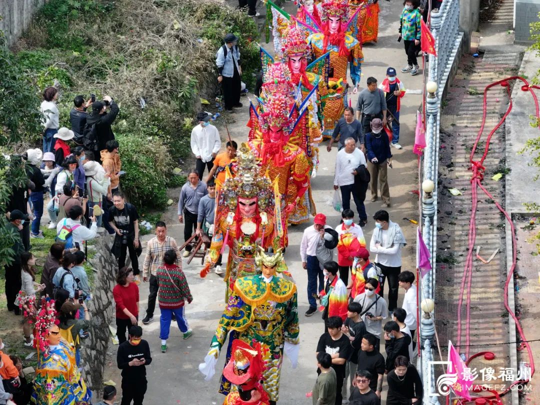 正月初十,300多尊塔骨神陆续集合,从供奉英烈王的英武庙开始出发,由保长公带领炮手、旗锣、高照开道,舞龙、舞狮、板鼓、肩头戏、八家将等队伍依照顺序绕行十几个自然村,沿路会加入游行表演,一派热闹景象。