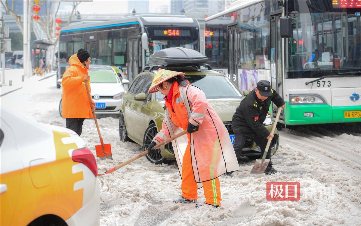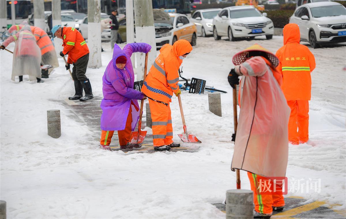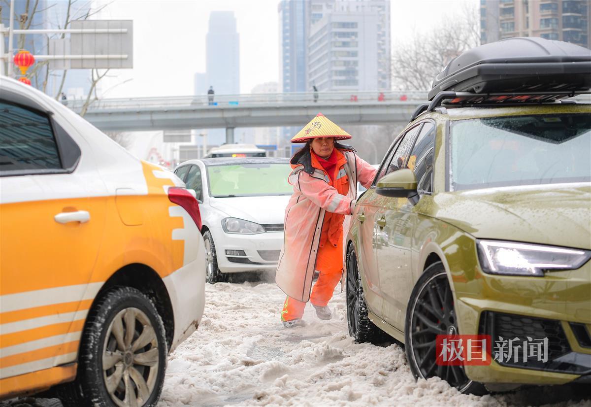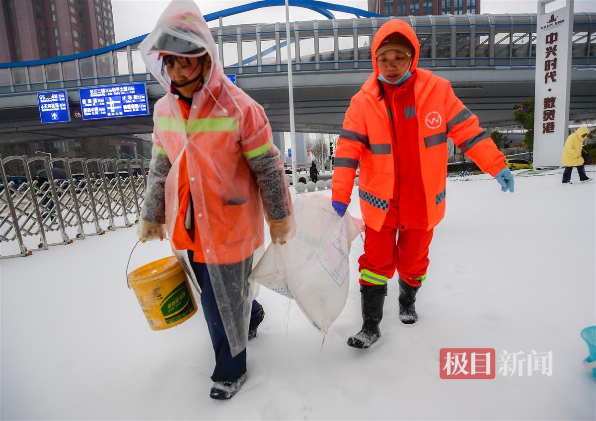 2月22日,经过一夜的飘雪,整个城市被白雪覆盖,市民出行变得困难。在徐东大街,身穿橙色工作服的环卫工人忙碌的身影,成为了大雪中一道独特的风景。