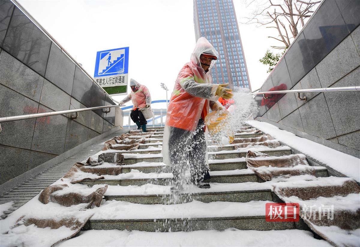 在铲雪的过程中,环卫工人们还不忘在公交站和地下通道入口处撒上融雪剂,以防止地面积雪结冰,保障市民出行安全。