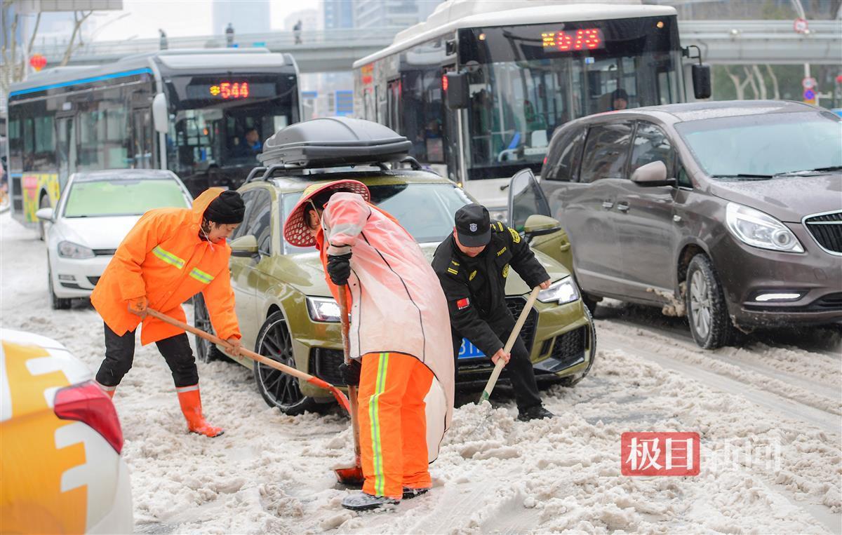 环卫工人们还帮助路边被困在雪地里的司机师傅。他们不顾寒冷,帮忙推车,帮助车辆脱离困境。