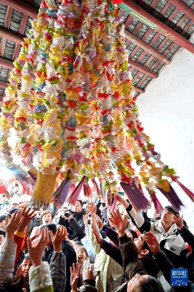 2月22日,在浙江省金华市武义县俞源乡俞源古村,村民在举行传统民俗活动“擎台阁”。