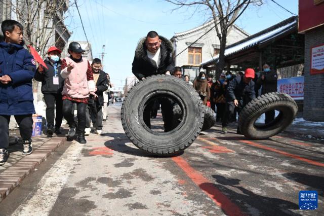 2月22日,村民在河北省邯郸市邯山区河沙镇镇南街村参加翻轮胎比赛。
