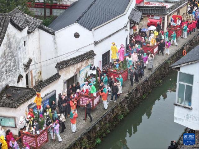 2月22日,在浙江省金华市武义县俞源乡俞源古村,村民举行传统民俗活动“擎台阁”(无人机照片)。