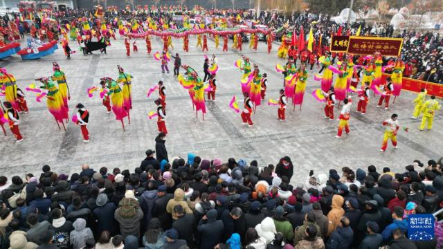 2月22日,民间艺人在甘肃省和政县聚兴广场表演舞龙(无人机照片)。
