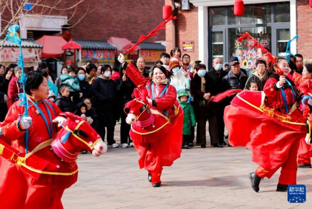 2月22日,社火队在山西省临汾市襄汾县丁陶风情街表演竹马。