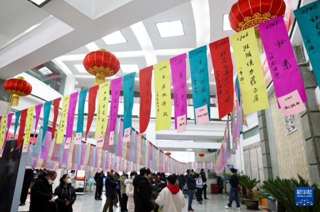 2月22日,在江苏省宿迁市泗阳县文化馆,人们在迎元宵活动上猜灯谜。