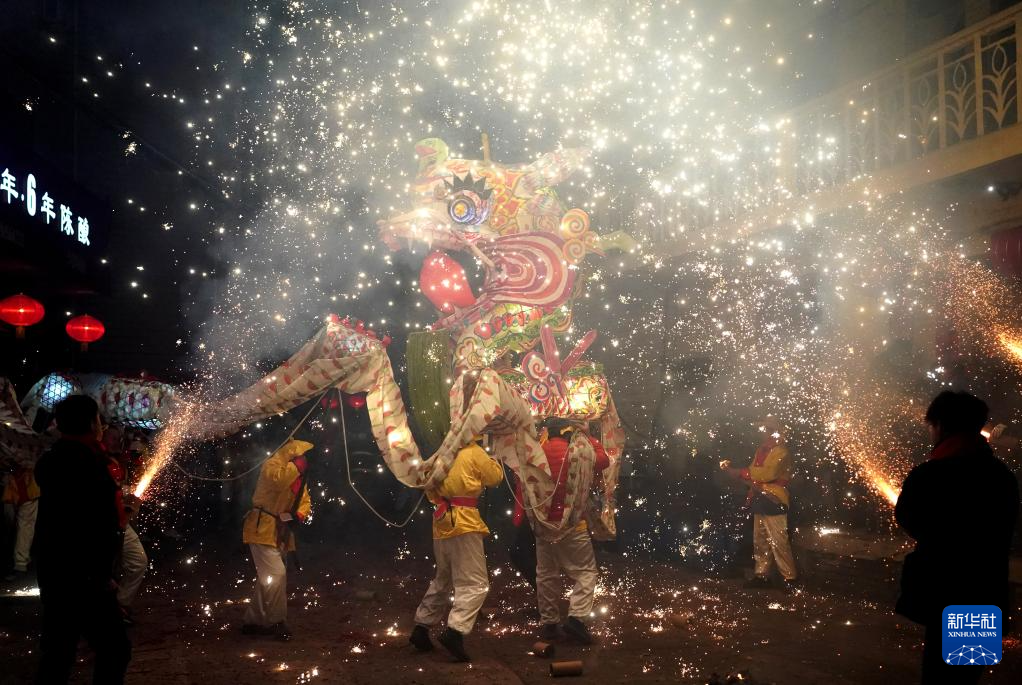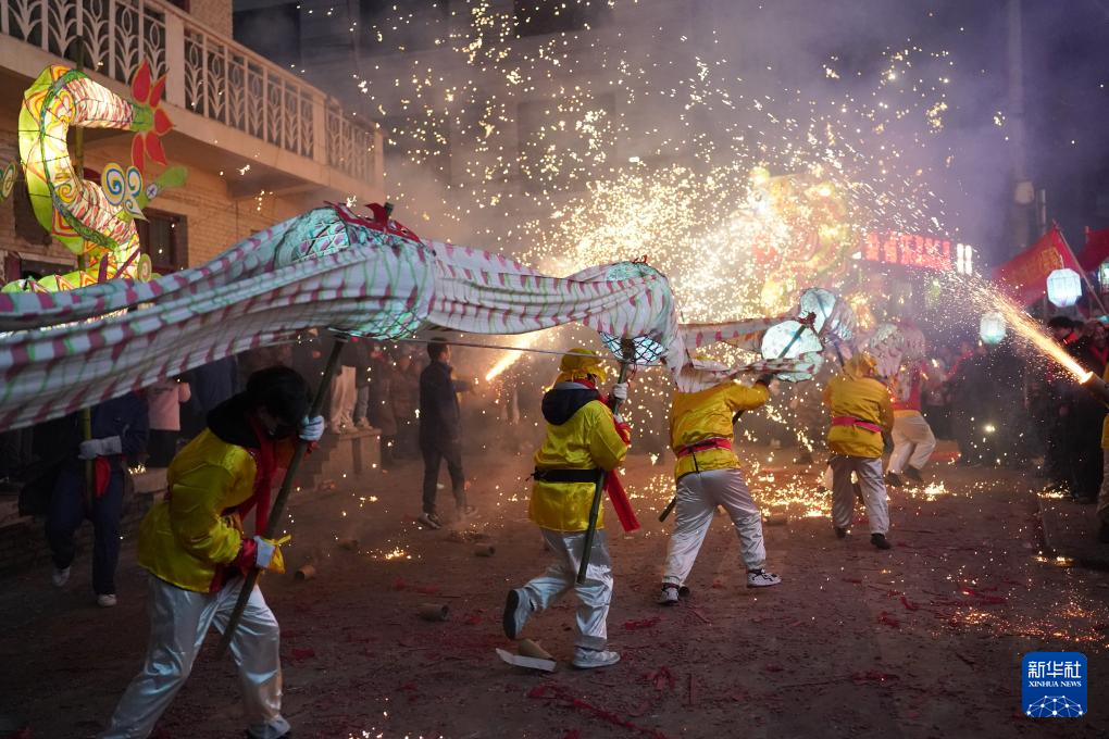 2月22日,神河懒龙舞龙队伍在旬阳市神河镇表演烧灯。