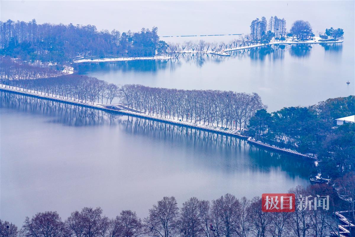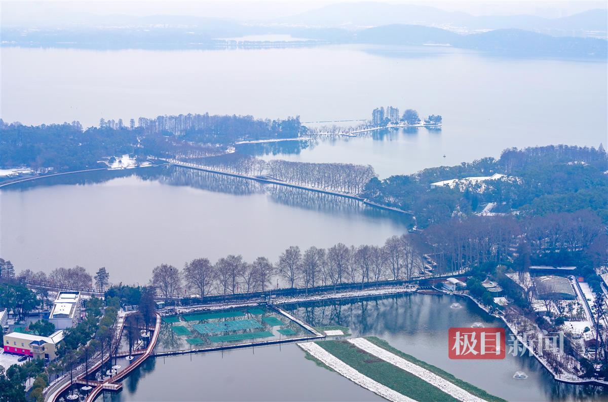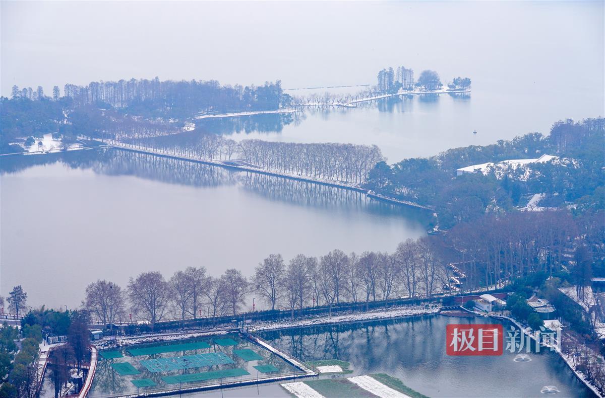 当天上午,极目新闻记者在武昌东湖路一栋高楼上俯瞰东湖,在阳光的照射下,冰雪还未融化的东湖公园依然银装素裹。亭台楼阁、小桥湖水、已掉光叶子的梧桐树,在白雪的装点下如诗如画,分外妖娆。