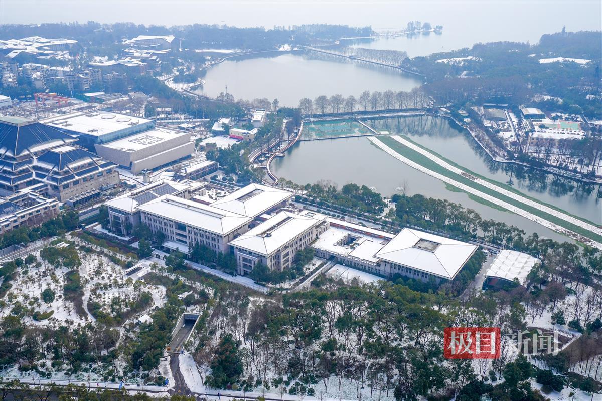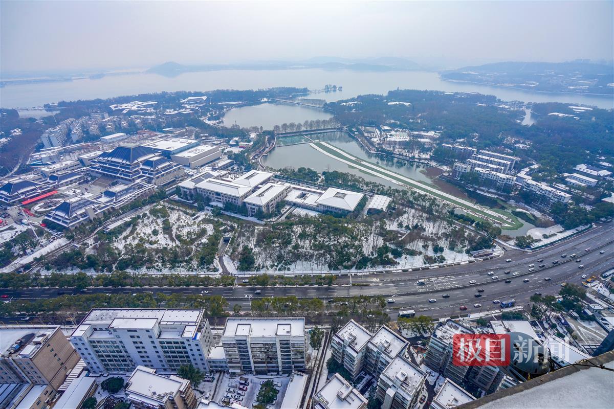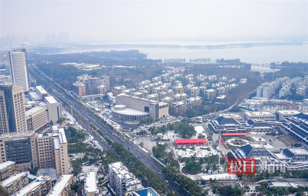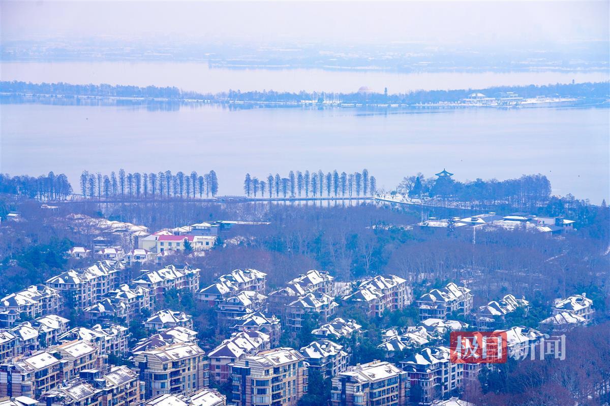 当天上午,极目新闻记者在武昌东湖路一栋高楼上俯瞰东湖,在阳光的照射下,冰雪还未融化的东湖公园依然银装素裹。亭台楼阁、小桥湖水、已掉光叶子的梧桐树,在白雪的装点下如诗如画,分外妖娆。